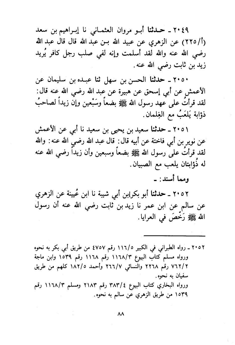 2052 - حَدَّثَنَا أَبُو بَكْرِ بْنُ أَبِي شَيْبَةَ، نا ابْنُ عُيَيْنَةَ، عَنِ الزُّهْرِيِّ، عَنْ سَالِمٍ، عَنِ ابْنِ عُمَرَ، نا زَيْدُ بْنُ ثَابِتٍ رَضِيَ اللَّهُ عَنْهُ «أَنَّ رَسُولَ اللَّهِ صَلَّى اللهُ عَلَيْهِ وَسَلَّمَ §رَخَّصَ فِي الْعَرَايَا»