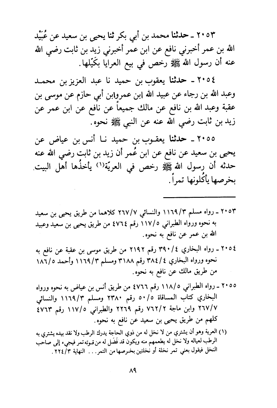 2055 - حَدَّثَنَا يَعْقُوبُ بْنُ حُمَيْدٍ، نا أَنَسُ بْنُ عِيَاضٍ، عَنْ يَحْيَى بْنِ سَعِيدٍ، عَنْ نَافِعٍ، عَنِ ابْنِ عُمَرَ، أَنَّ زَيْدَ بْنَ ثَابِتٍ، رَضِيَ اللَّهُ عَنْهُ حَدَّثَهُ «أَنَّ رَسُولَ اللَّهِ صَلَّى اللهُ عَلَيْهِ وَسَلَّمَ §رَخَّصَ فِي الْعَرِيَّةِ يَأْخُذُهَا أَهْلُ الْبَيْتِ بِخَرْصِهَا يَأْكُلُونَهَا تَمْرًا»