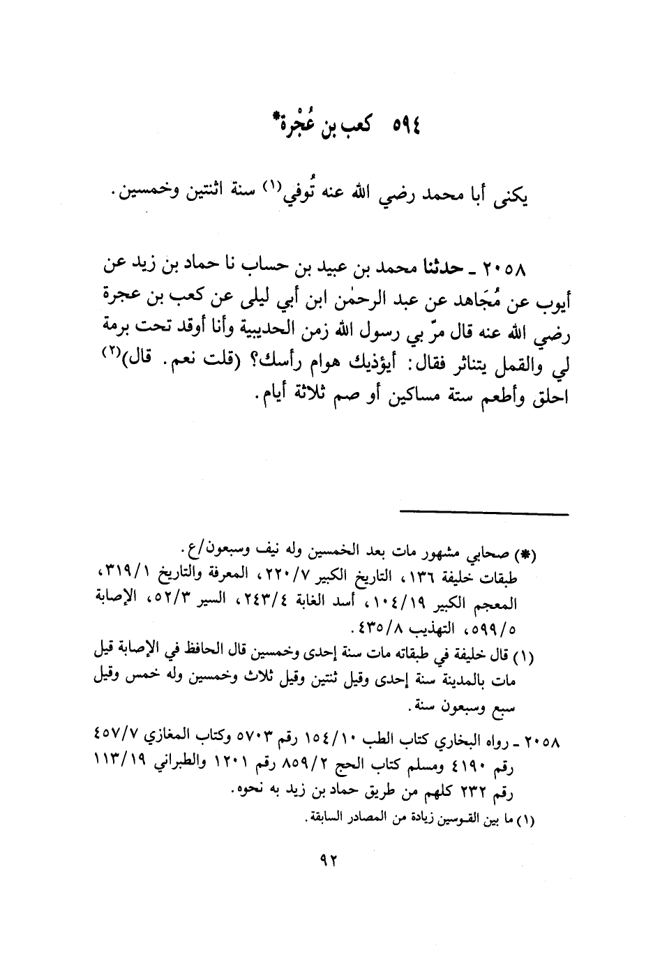 2059 -[93]- حَدَّثَنَا يَعْقُوبُ، نا سُفْيَانُ بْنُ عُيَيْنَةَ، عَنِ ابْنِ أَبِي نَجِيحٍ، عَنْ مُجَاهِدٍ، عَنْ عَبْدِ الرَّحْمَنِ بْنِ أَبِي لَيْلَى، عَنْ كَعْبِ بْنِ عُجْرَةَ، رَضِيَ اللَّهُ عَنْهُ عَنِ النَّبِيِّ، صَلَّى اللهُ عَلَيْهِ وَسَلَّمَ نَحْوَهُ