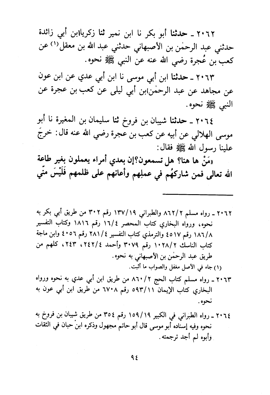2064 - حَدَّثَنَا شَيْبَانُ بْنُ فَرُّوخٍ، ثنا سُلَيْمَانُ بْنُ الْمُغِيرَةِ، نا أَبُو مُوسَى الْهِلَالِيُّ، عَنْ أَبِيهِ، عَنْ كَعْبِ بْنِ عُجْرَةَ، رَضِيَ اللَّهُ عَنْهُ قَالَ: خَرَجَ عَلَيْنَا رَسُولُ اللَّهِ صَلَّى اللهُ عَلَيْهِ وَسَلَّمَ فَقَالَ: «§مَنْ هَا هُنَا؟ هَلْ تَسْمَعُونَ؟ إِنَّ بَعْدِي أُمَرَاءَ يَعْمَلُونَ بِغَيْرِ طَاعَةِ اللَّهِ تَعَالَى فَمَنْ شَارَكَهُمْ فِي عَمَلِهِمْ، وَأَعَانَهُمْ عَلَى ظُلْمِهِمْ فَلَيْسَ مِنِّي وَلَسْتُ مِنْهُ، وَمَنْ لَمْ يُشَارِكْهُمْ فِي عَمَلِهِمْ وَلَمْ يُعِنْهُمْ عَلَى ظُلْمِهِمْ فَهُوَ مِنِّي وَأَنَا مِنْهُ»