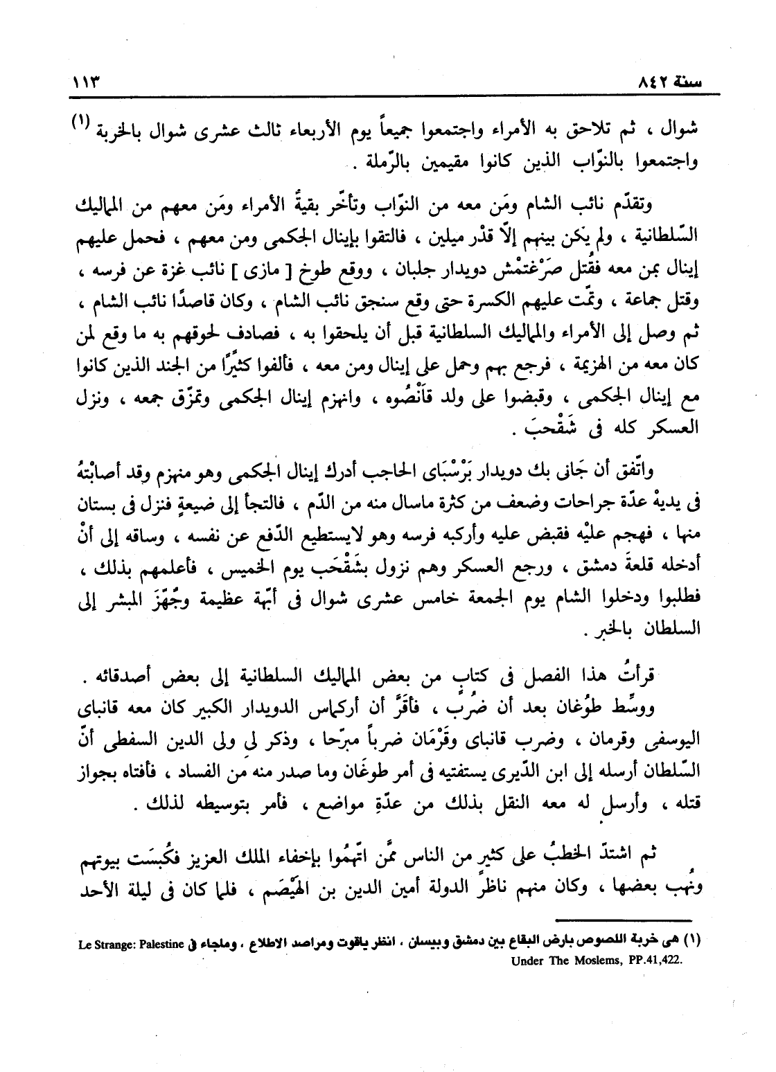 من شوال، ثم تلاحق به الأمراء واجتمعوا جميعاً يوم الأربعاء ثالث عشري شوال بالخربة، واجتمعوا بالنواب الذي كانوا مقيمين بالرملة وتقدم نائب الشام ومن معه من النواب، وتأخر بقية الأمراء ومن معهم من المماليك السلطانية، ولم يكن بينهم إلا قدر ميلين فالتقوا بأينال الجكمي ومن معه، فحمل عليهم أينال الجكمي - بمن معه فقتل صرغتمش دوادار جلبان ووقع طوخ نائب غزة عن فرسه وقتل جماعة، وتمت عليه الكسرة حتى وقع سنجق نائب الشام وكان قاصداً نائب الشام وصل إلى الأمراء والمماليك السلطانية قبل أن يلحقوا به، فصادف لحوقهم به ما وقع لمن كان معه من الهزيمة، فرجع بهم وحمل على أينال ومن معه - فألقوا كثيراً من الجند الذي كانوا مع أينال الجكمي - وقبضوا على ولد قانصوه النوروزي وكان من الشجعان المشهورة، وانهزم أينال الجكمي وتمزق جمعه ونزل العسكر كله في شقحب، واتفق أن جانبك دويدار برسباي الحاجب أدرك أينال الجكمي وهو منهزم وقد أصابته في بدنه عدة جراحات وضعف من كثرة ما سال منه من الدم، فالتجأ إلى ضيعة فنزل في بستان منها، فهجم عليه فقبض عليه واركبه فرسه وهو لا يستطيع الدفع عن نفسه وساقه إلى أن أدخله قلعة دمشق، ورجع إلى العسكر وهم نزول بشقحب يوم الخميس فاعلمهم الخبر، ففرحوا واطمأنوا - فطلبوا ودخلوا الشام يوم الجمعة خامس عشري شوال في أبهة عظيمة. وجهزوا المبشر إلى السلطان بالخبر.