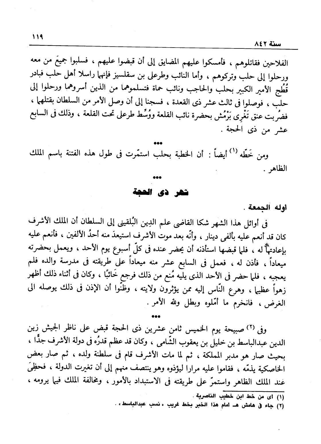شهر ذي الحجة - الحرام أوله الجمعة - في أوائل هذا الشهر شكا القاضي علم الدين - صالح - البلقيني إلى السلطان أن الملك الأشرف كان قد أنعم عليه بألفي دينار، وأنه بعد موت الأشرف استعيد منه أحد الألفين فأنعم عليه بإعادتهما له فلما قضهما استأذنه أن يحضر عنده في كل أسبوع يوم الأحد ويعمل بحضرته ميعاداً فأذن له، فعمل في السابع عشر منه ميعاداً على طريقته في مدرسة والده فلم يعجبه، فلما حضر في الأحد الذي يليه منع من ذلك فرجع خائباً، وكان في أثناء ذلك قد أظهر زهواً عظيماً وهرع إليه ناس ممن يؤثر ولايته وظنوا أن الإذن في ذلك يوصله إلى الغرض، فانحزم ما أملوه وبطل - ولله الأمر -.