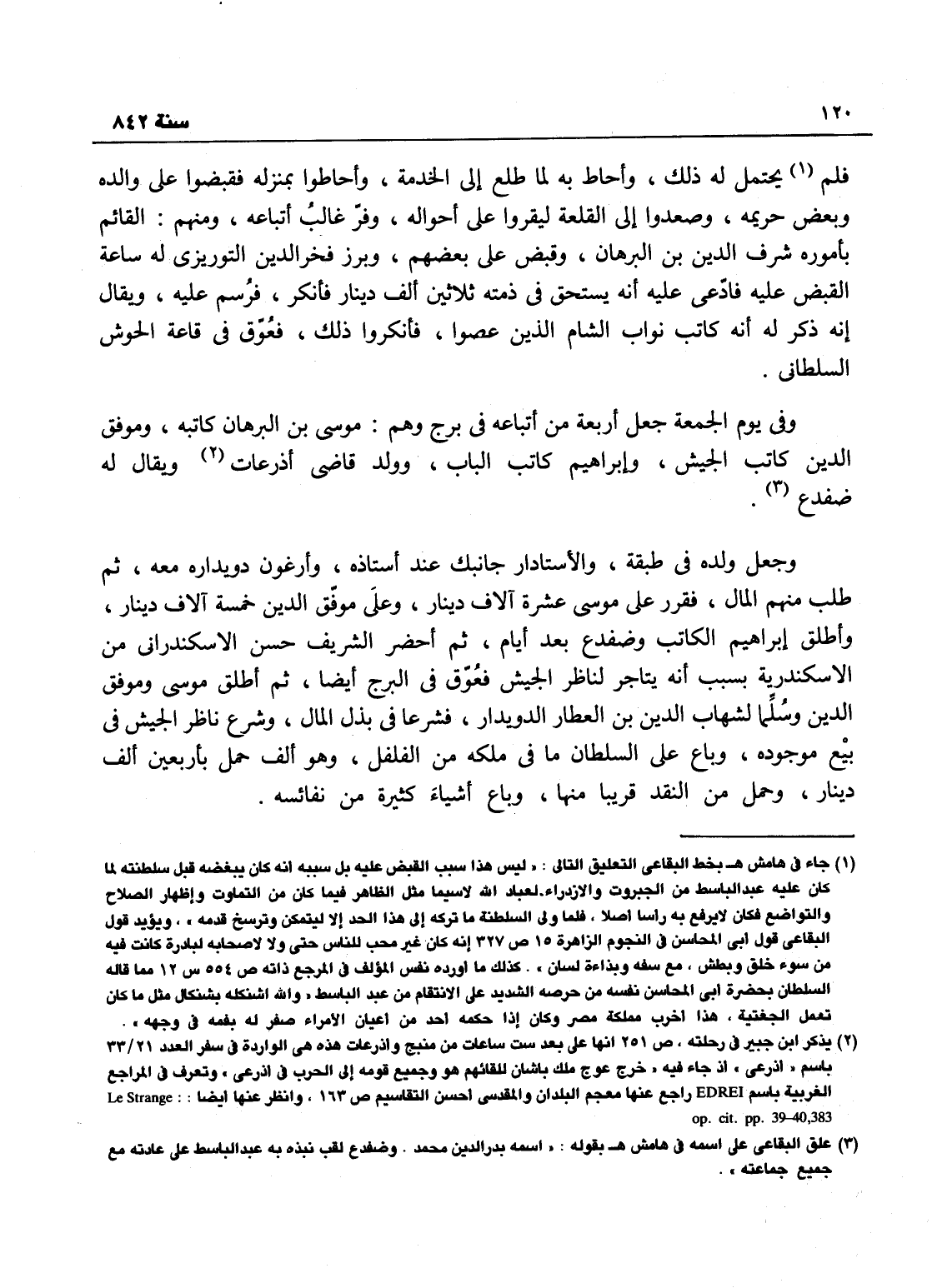 وفي يوم الجمعة جعل أربعة من أتباعه في البرج وهم موسى بن البرهان كاتبه وموفق الدين كاتب الجيش وإبراهيم - الصغير - كاتب الباب وولد القاضي أذرعات ويقال له ضفدع وجعل ولده في طبقة والأستادار جانبك عند أستاذه وأرغون دويداره معه ثم طلب منهم المال، فقرر على موسى عشرة آلاف دينار، وعلى موفق الدين خمسة آلاف دينار، وأطلق إبراهيم الكاتب وضفدع بعد أيام، ثم أحضر الشريف حسن الإسكندراني من الإسكندرية بسبب أنه تاجر لناظر الجيش فعوق في البرج أيضاً، ثم أطلق موسى وموفق الدين وسلما لشهاب الدين - أحمد - بن العطار الدويدار فشرعا في بذل المال؛ وشرع ناظر الجيش في بيع موجوده وباع على السلطان ما في ملكه من الفلفل وهو ألف جمل بأربعين ألف دينار، وحمل من النقد قريباً منها، وباع أشياء كثيرة من نفائسه،