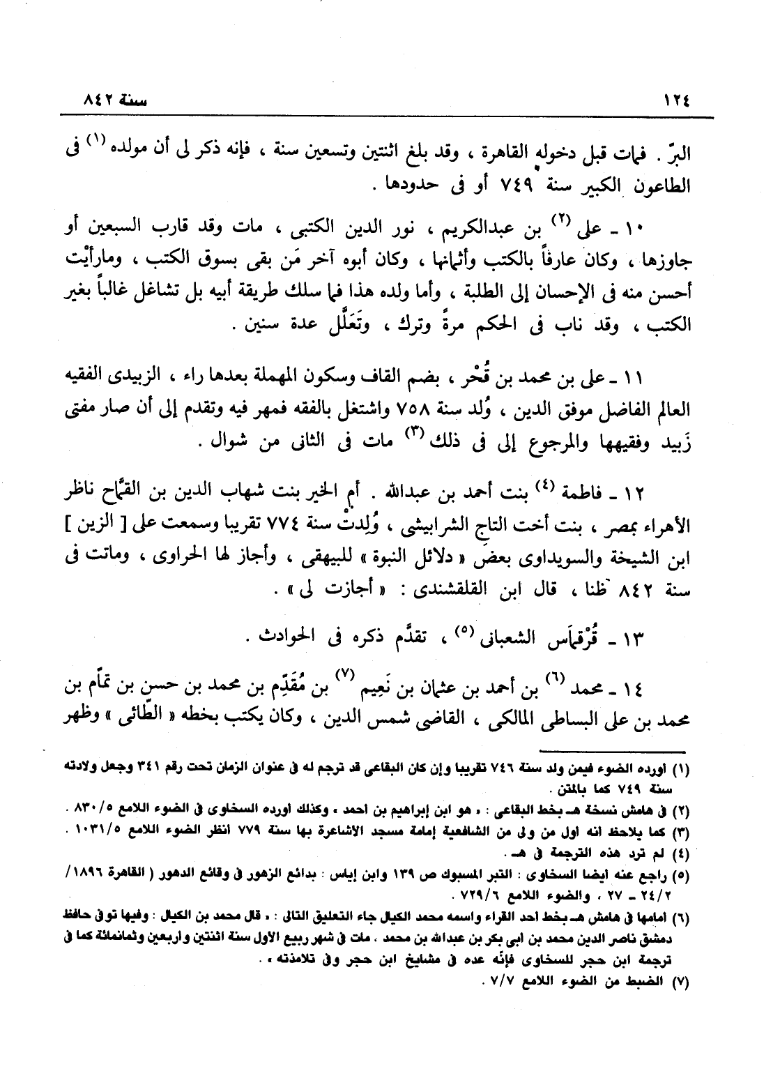 علي بن عبد الكريم نور الدين الكتنى، مات وقد قارب السبعين أو جاوزها وكان عارفاً بالكتب وأثمانها وكان أبوه آخر من بقي بسوق الكتب وما رأيت مثله في الإحسان إلى الطلبة وأما ولده هذا فما سلك طريق أبيه بل تشاغل غالباً بغير الكتب، وقد ناب في الحكم مرة، وترك وتعلل عدة سنين.