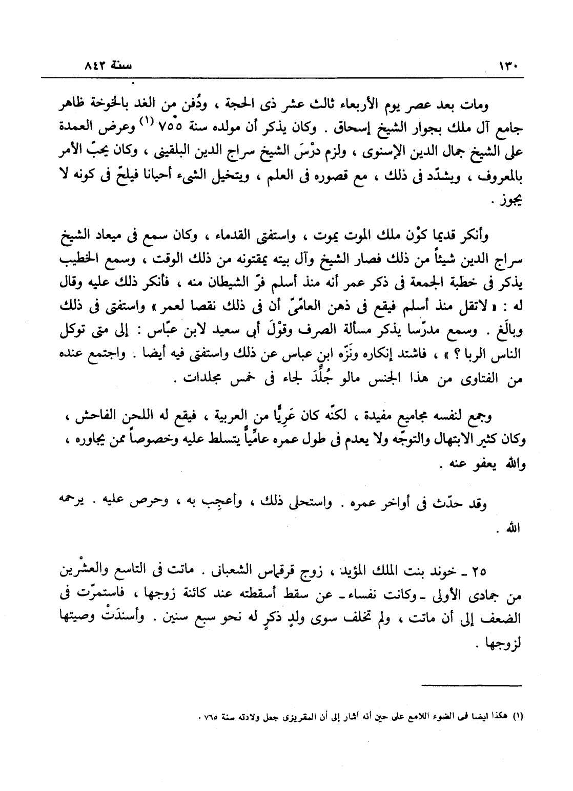 وناصر الدين الطبردار وغيرهما وحدث، وكان يذكر أن مولده سنة 757، وعرض العمدة على الشيخ جمال الدين الأسنوي، ولازم الشيخ سراج الدين البلقيني، وكان يحب الأمر بالمعروف ويشدد في ذلك مع قصوره في العلم، ويتخيل الشيء أحياناً فيلح في كونه لا يجوز، أنكير قديماً كون ملك الموت يموت واستفتى القدماء، وكان سمع في ميعاد الشيخ سراج الدين شيئاً من ذلك - فصار الشيخ وآل بيته يمقتونه من ذلك الوقت، وسمع الخطيب يذكر في خطبة الجمعة في ذكر عمر أنه منذ أسلم فر الشيطان منه، فأنكر عليه وقال: لا تقل: منذ أسلم، يقع في ذهن العامي أن في ذلك نقصاً لعمر، واستفتى في ذلك فبالغ، وسمع مدرساً يذكر مسألة الصرف وقول أبي سعيد لابن عباس: إلى متى تؤكل الناس الربا؟ فاشتد إنكاره ونزه ابن عباس عن ذلك واستفتى، واجتمع عنده من الفتاوي من هذا الجنس مالو جلد لجاء في خمس مجلدات، وجمع لنفسه مجاميع مفيدة لكنه كان عرياً من العربية فيقع له اللحن الفاحش، وكان كثير الابتهال والتوجه. ولا يعدم في طول عمره عامياً يتسلط عليه وخصوصاً ممن يجاوره - والله يعفو عنه؟ وقد حدث في آخر عمره واستحلى ذلك وأعجب به وحرص عليه - رحمه الله.
