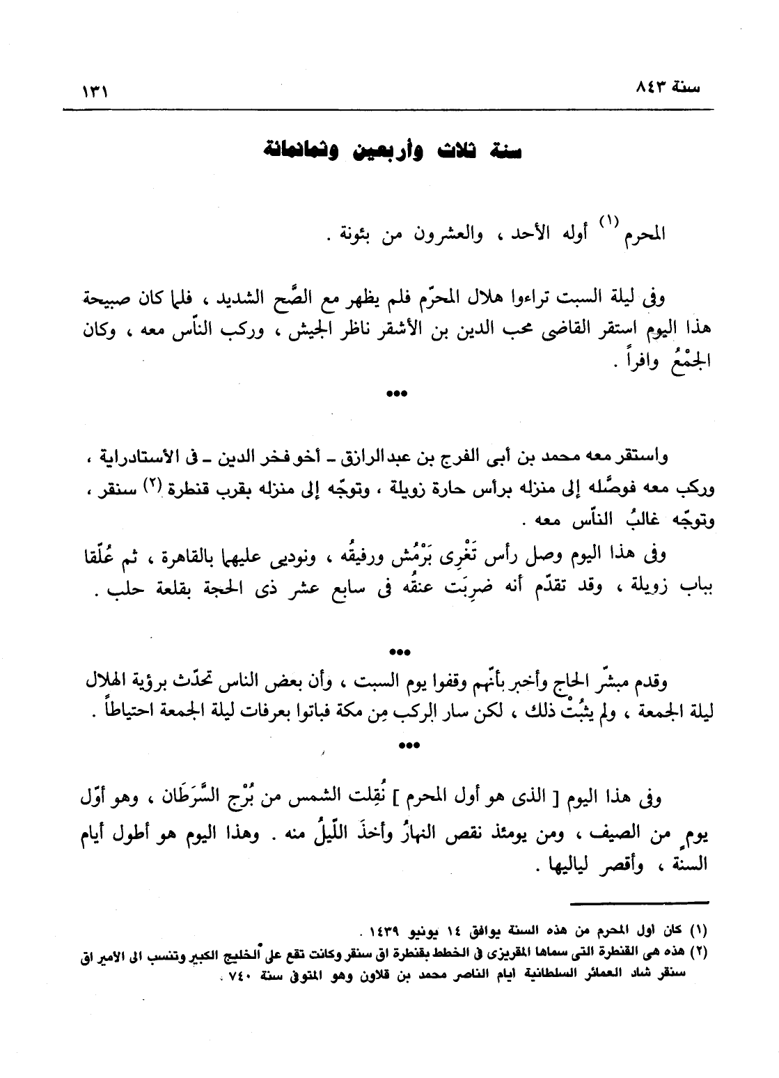 المحرم - أوله الأحد، العشرين من بونة من أشهر القبط -، وفي ليلة السبت تراءوا هلال المحرم فلم يظهر مع الصحو الشديد، فلما كان صبيحة هذا اليوم استقر القاضي محب الدين بن الأشقر ناظر الجيش وركب الناس معه وكان الجمع وافراً، واستقر معه محمد بن أبي الفرج عبد الرزاق أخو فخر الدين في الأستادارية، فركب معه فوصله إلى منزله برأس حارة زويلة، وتوجه إلى منزله بقرب قنطرة سنقر، وتوجه غالب الناس معه.