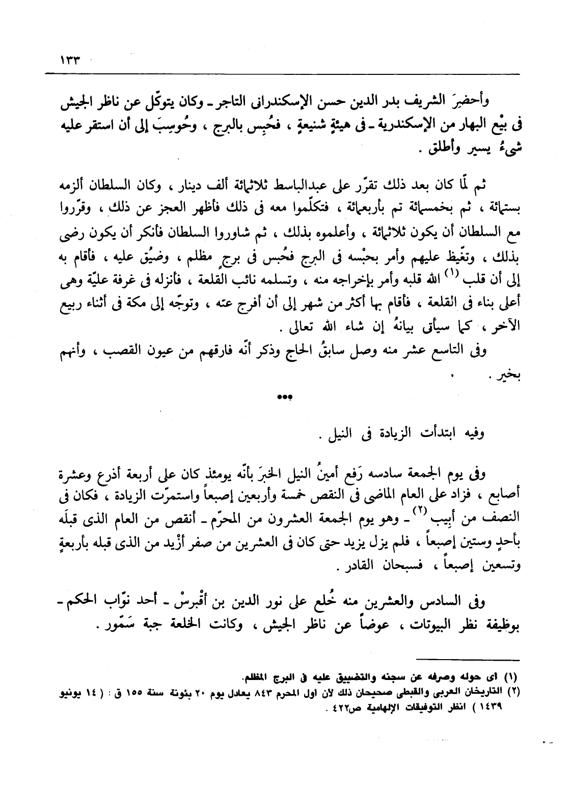 وأحضر الشريف بدر الدين حسن الإسكندراني التاجر، وكان يتوكل عن ناظر الجيش في بيع النبهار من الإسكندرية في هيئة شنيعة، فحبس بالبرج وحوسب إلى إن استقر عليه شيء يسير وأطلق، ثم لما كان بعد ذلك تقرر على عبد الباسط ثلاثمائة ألف دينار، وكان السلطان ألزمه بستمائة، ثم بخمسمائة ثم بأربعمائة، فتكلموا معه في ذلك فأظهر العجز عن ذلك، وقرروا مع السلطان أن يكون ثلاثمائة وأعلموه بذلك، ثم شاوروا السلطان فأنكر أن يكون رضي بذلك، وتغيظ عليهم وعليه وأمر بحبسه في البرج، فحبس في برج مظلم وضيق عليه، فأقام إلى أن قلب الله قلبه وأمر بإخراجه منه، وتسلمه نائب القلعة فأنزله في غرفة علية وهي أعلى بناء في القلعة، فأقام بهاأكثر من شهر إلى أن افرج عنه.
