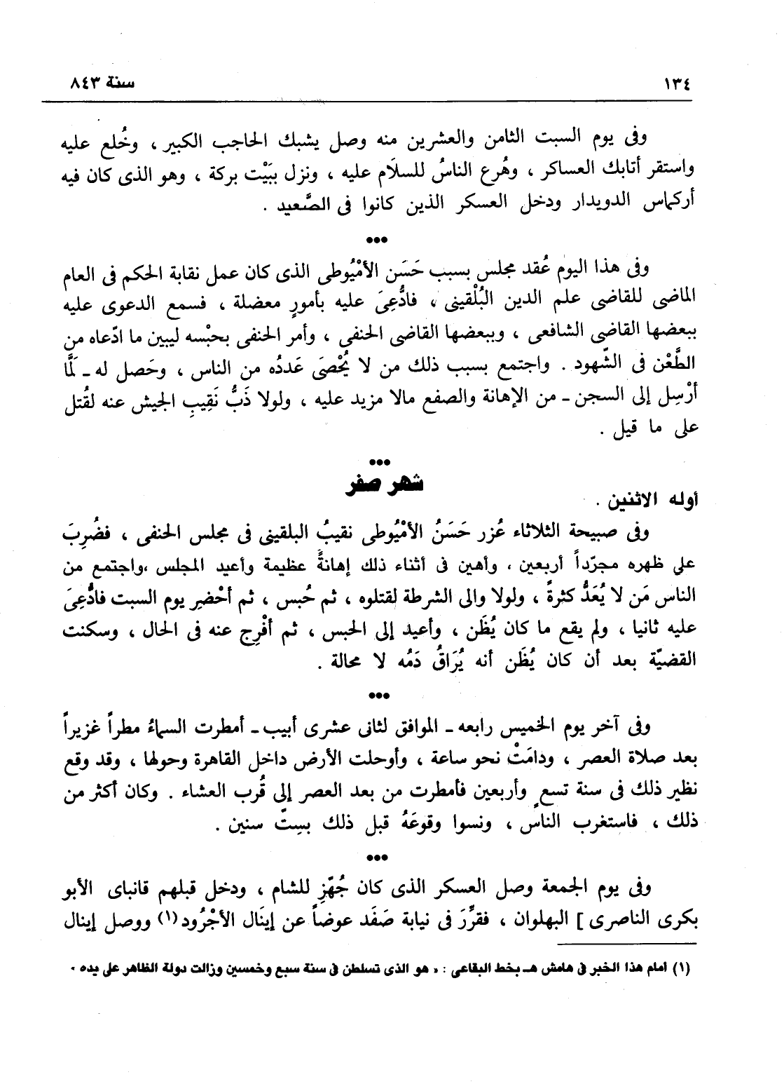 وفي يوم الجمعة وصل العسكر الذي كان جهز إلى الشام، ودخل قبلهم قانباي البهلوان فقرر في نيابة صفد عوضاً عن إينال الأجرود، وصل إينال