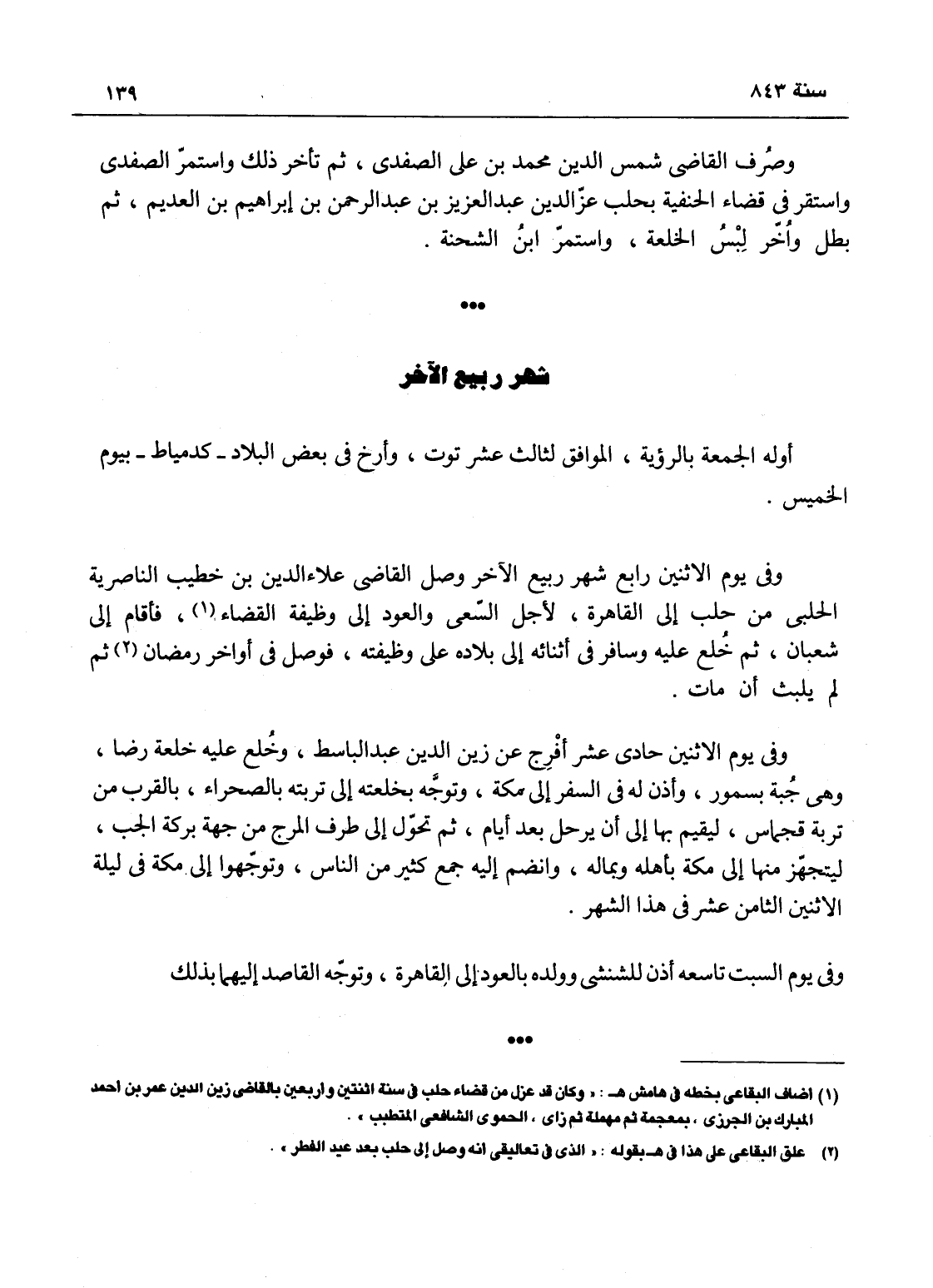 شهر ربيع الآخر - أوله الجمعة بالرؤية موافق لثالث عشر توت، وأرخ في بعض البلاد كدمياط بيوم الخميس، وفي يوم الاثنين رابع شهر ربيع الآخر وصل القاضي علاء الدين ابن خطيب الناصرية الحلبي من حلب إلى القاهرة من أجل السعي في العود إلى وظيفة القضاء، فأقام إلى شعبان ثم خلع عليه وسافر في أثنائه إلى بلاده على وظيفته فوصل في أواخر رمضان، ثم لم يلبث أن مات.
