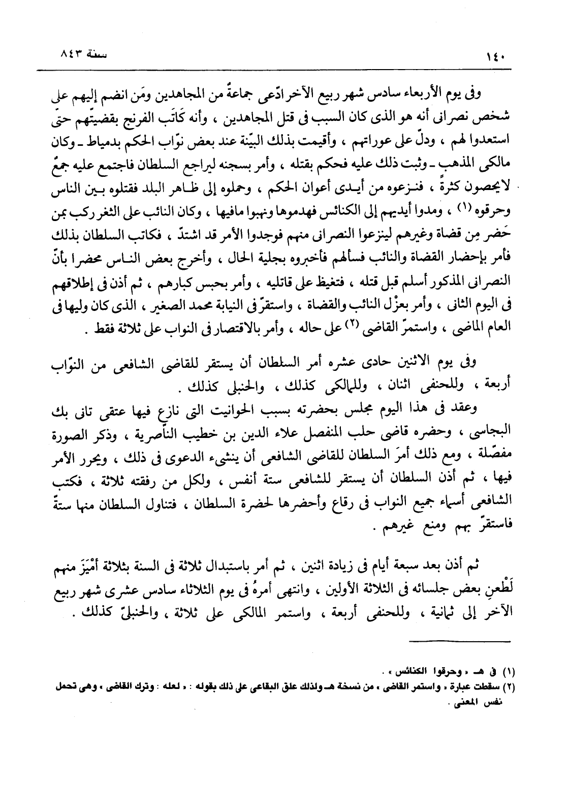 وفي يوم الأربعاء سادس شهر ربيع الآخر ادعى جماعة من المجاهدين ومن انضم إليهم على شخص نصراني أن هو الذي كان السبب في قتل المجاهدين وأنه كاتب الفرنج بقضيتهم حتى استعدوا لهم ودل على عوراتهم، وأقيم بذلك البينة عند بعض نواب الحكم بدمياط مالكي المذهب، وثبت ذلك عليه فحكم بقتله وأمر بسجنه ليراجع السلطان، فاجتمع عليه جمع لا يحصون كثرة فنزعوه من أيدي أعوان الحكم وحملوه إلى ظاهر البلد فقتلوه بين الكنائس وحرقوه، ومدوا أيديهم إلى الكنائس فهدوموها ونهبوا ما فيها، وكان النائب بالثغر ركب بمن حضر من القضاة وغيرهم لينزعوا النصارني منهم، فوجدوا الأمر قد اشتد فكاتب السلطان بذلك، فأمر بإحضار القضاة والنائب فسألهم فأخبروه بجلية الحال، وأخرج بعض الناس محضراً بأن النصراني المذكور أسلم قبل قتله، فتغيظ على قاتليه وأمر بحبس كبارهم، ثم أذن في إطلاقهم في اليوم الثاني وأمر بعزل النائب والقضاة، فاستقر في النيابة محمد الصغير معلم النشاب - الذي كان وليها في العام الماضي، واستمر القاضي - على حاله، وأمر في الاقتصار في النواب على ثلاثة فقط.