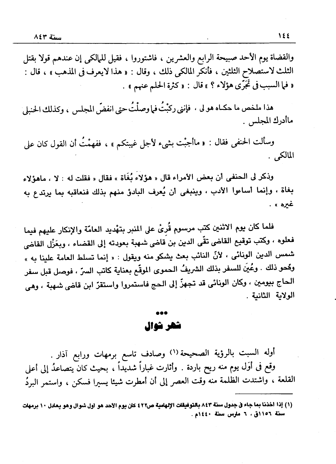 شهر - شوال المبارك أوله السبت بالرؤية الصحيحة، وصادف تاسع برمهات ورابع آذار، وقع في أول يوم منه ريح باردة، وأثارت غباراً شديداً بحيث كان يتصاعد إلى أعلى القلعة واشتدت الظلمة منه وقت العصر إلى أن أمطرت شيئاً يسيراً، فسكن واستمر البرد
