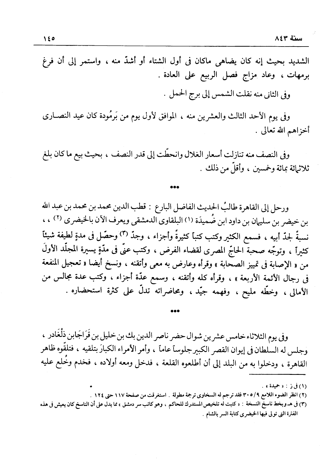 وفيه - رحل إلى القاهرة طالب حديث الفاضل البارع قطب الدين محمد بن محمد بن عبد الله بن خيضر بن سليمان بن داود بن فلاح بن ضميدة البلقاوي ويعرف الآن بالخيضري نسبة لجد أبيه، فسمع الكثير وكتب كتباً كثيرة وأجزاء، وجد وحصل في مدة لطيفة شيئاً كثيراً، وتوجه صحبة الحاج المصري لقضاء الفرض، وكتب عني في مدة يسيرة المجلد الأول من الإصابة بتمييز الصحابة وقرأه وعارض به معي وأتقنه، ونسخ أيضاً تعجيل المنفعة في رجال الأربعة وقرأه كله وأتقنه، وسمع عدة أجزاء، وكتب عدة مجالس من الامالي؛ وخطه مليح وفهمه جيد، ومحاضراته تدل على كثرة استحضاره.
