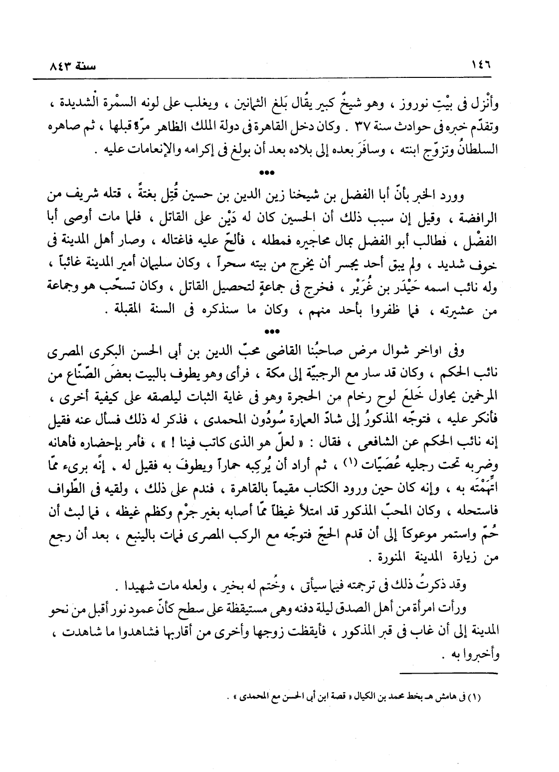 وورد الخبر بأن أبا الفضل ابن شيخنا زين الدين ابن حسين اغتيل فوجد لعبه، قتله شريف من الرافضة، وقيل: إن سبب ذلك أن الحسني كان له دين على القاتل فلما مات أوصى أبا الفضل، فطالب أبو الفضل بمال محاجيزه، فمطله فألح عليه فاغتاله، وصار أهل المدينة في خوف شديد، ولم يبق أحد يجسر أن يخرج من بيته سحراً، وكان سليمان أمير المدينة غائباً وله نائب اسمه حيدر بن عزيز فخرج في جماعة لتحصيل القاتل، وكان تسحب هو وجماعة من عشيرته، فما ظفروا بأحد منهم - وكان ما سنذكره في السنة المقبلة.