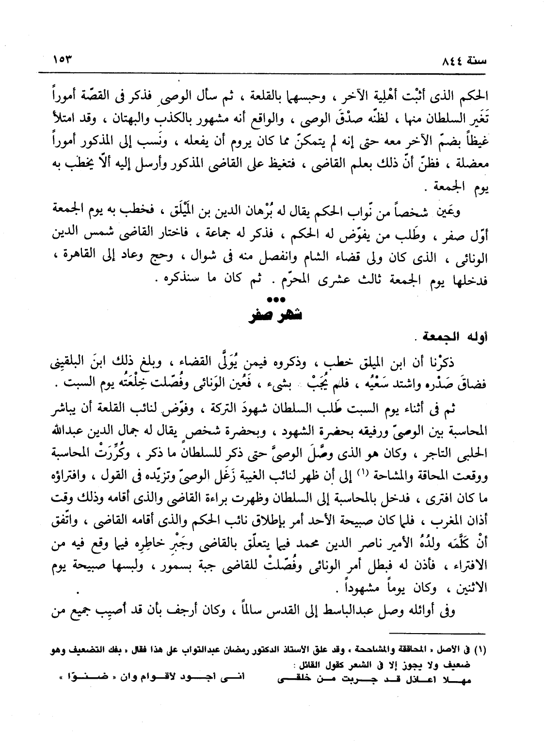 شهر صفر الأغر - أوله الجمعة، ذكرنا أن ابن الميلق خطب وذكروه فيمن تولى القضاء وبلغ ذلك صالح - ابن البلقيني فضاق صدره وعيل صبره واشتد سعيه، فلم يجب لشيء وتعين الونائي وفصلت خلعته يوم السبت، ثم في أثناء يوم السبت طلب السلطان شهود التركة وفوض لنائب القلعة أن يباشر المحاسبة بين الوصي ورفيقه بحضرة الشهود وبحضرة شخص يقال له جمال الدين عبد الله الحلبي التاجر، وكان هو الذي وصل الوصي حتى ذكر للسلطان ما ذكر، وكررت المحاسبة ووقعت المحاققة والمشاححة إلى أن ظهر لنائب الغيبة دغل الوصي وتزيده في القول وافتراءه ما كان افترى، فدخل بالمحاسبة إلى السلطان وظهرت براءة القاضي والذي أقامه، وذلك وقت أذان المغرب؛ فلما كان صبيحة الأحد أمر بإطلاق نائب الحكم والذي أقامه القاضي، واتفق أن كلمه ولده الأمير ناصر الدين محمد فيما يتعلق بالقاضي وجبر خاطره فيما وقع فيه من الافتراء، فأذن له فبطل أمر - الونائي، وفصلت للقاضي جبة سمور ولبسها صبيحة الاثنين وكان يوماً مشهوداً.