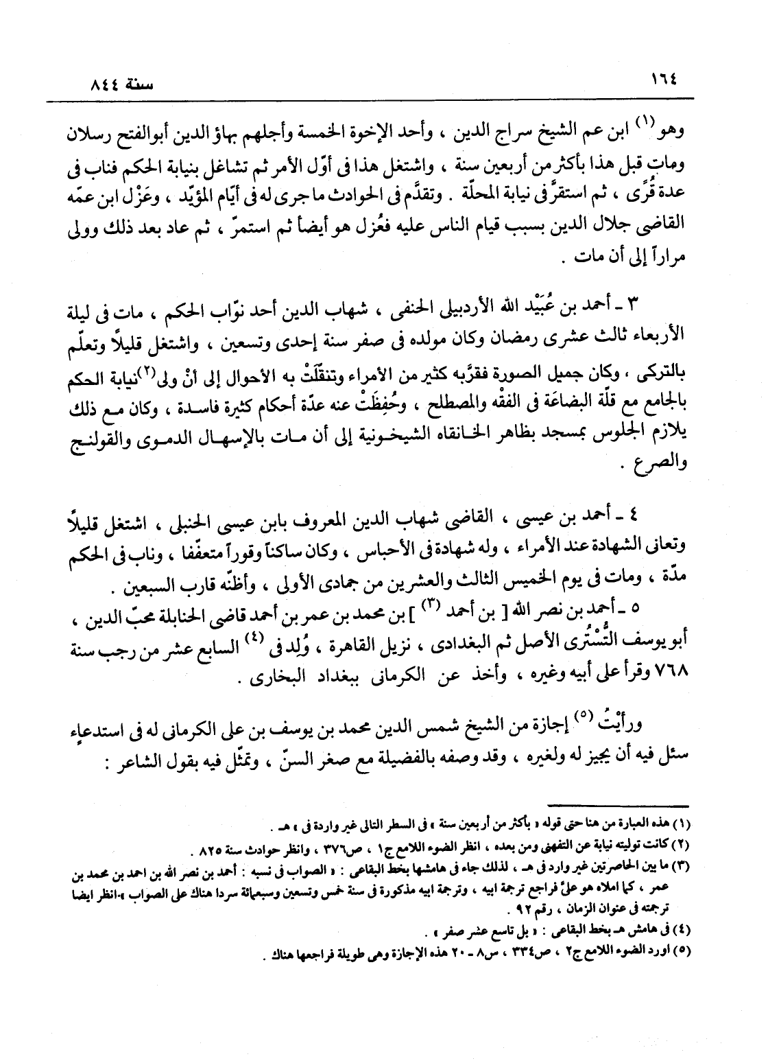 أحمد بن عيسى القاضي شهاب الدين المعروف بابن عيسى الحنبلي، اشتغل قليلاً، وتعاني الشهادة عند الأمراء وله شهادة في الأحباس، وكان ساكناً وقوراً متعففاً، وناب في الحكم مدة، ومات في يوم الخميس الثالث والعشرين من جمادى الأولى، وأظنه قارب السبعين.