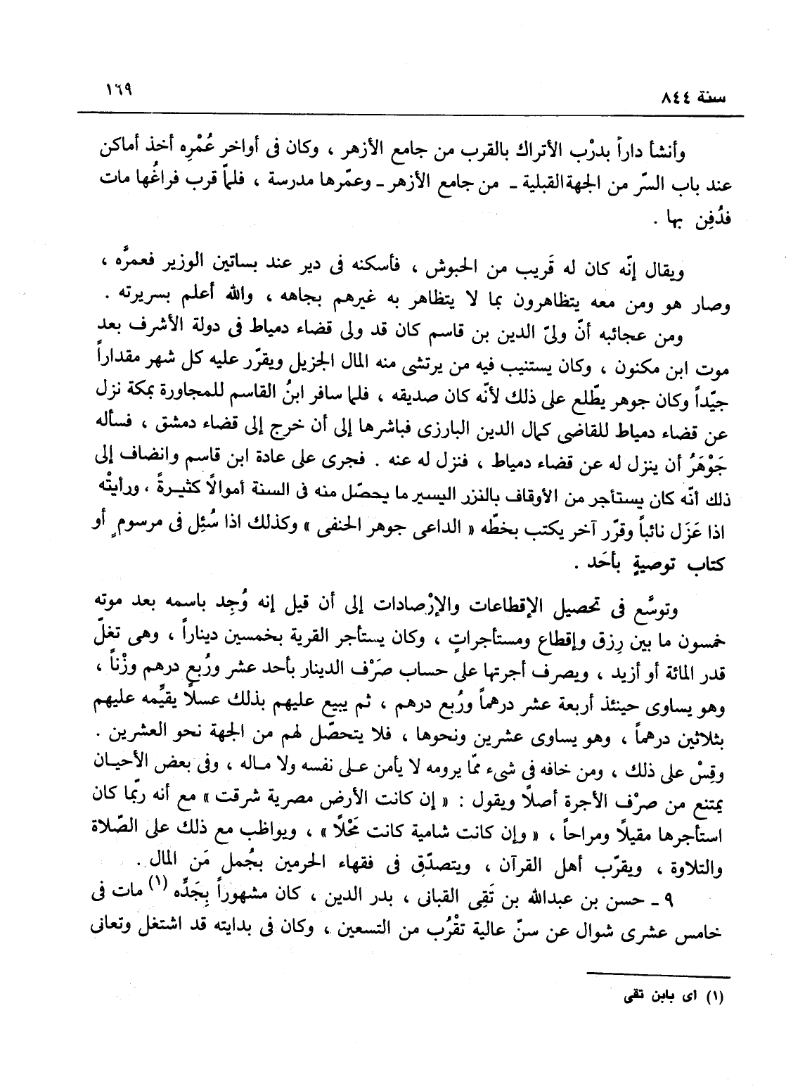 ومن عجائبه أن ولي الدين بن قاصم كان قد ولي قضاء دمياط في دولة الأشرف بجاهه بعد موت ابن مكنون، فكان يستنيب فيها من يرتشي من المال الجزيل ويقرر عليه كل شهر مقداراً جيداً فكان جوهر يطلع على ذلك لأنه صديقه، فلما سافر ابن قاسم للمجاورة بمكة نزل عن قضاء دمياط للقاضي كمال الدين البازري، فباشرها إلى أن خرج إلى قضاء دمشق، فسأل جوهر أن ينزل له عن قضاء دمياط فنزل له - عن فجرى على عادة ابن قاسم، وانضاف إلى ذلك أنه يستأجر من الأوقاف بالنزر اليسير بما يحصل منه في السنة أموالاً كثيرة، ورأيته إذا عزل نائباً وقرر آخر يكتب بخطه الداعي جوهر الحنفي، وكذلك إذا سئل في مرسوم أو كتاب بالوصية بأحد، وتوسع في تحصيل الإقطاعات والإرصادات إلى أن قيل إنه وجد باسمه بعد موته نحو خمسين ما بين رزق وإقطاع ومن المستأجرات وكان يستأجر القرية بخمسين ديناراً وهي تغل قدر المائة أو أزيد، ويصرف أجرتها على حساب صرف الدينار بأحد عشر وربع درهم وزناً وهو يساوي حينئذ أربعة عشر درهماً وربع درهم، ثم يبيع عليهم بذلك عسلاً يقيمه عليهم بثلاثين درهما وهو يساوي عشرين ونحوها، فلا يتحصل لهم من الجهة نحو العشرين - وقس على ذلك، ومن خالفه في شيء مما يرومه لا يأمن على نفسه ولا ماله، وفي الأحيان يمتنع من صرف الأجرة أصلا ويقول: إن كانت الأرض مصرية شرقت مع أنه كان ربما استأجرها مقيلاً ومراحاً، وإن كانت شامية يقول - كانت محلاً راعاً كانت في تلك السنة أو عند الأرض مطراً؛ ويواظب مع ذلك على الصلاة والتلاوة، ويقرب أهل القرآن، ويتصدق في فقراء الحرمين بجمل من المال.
