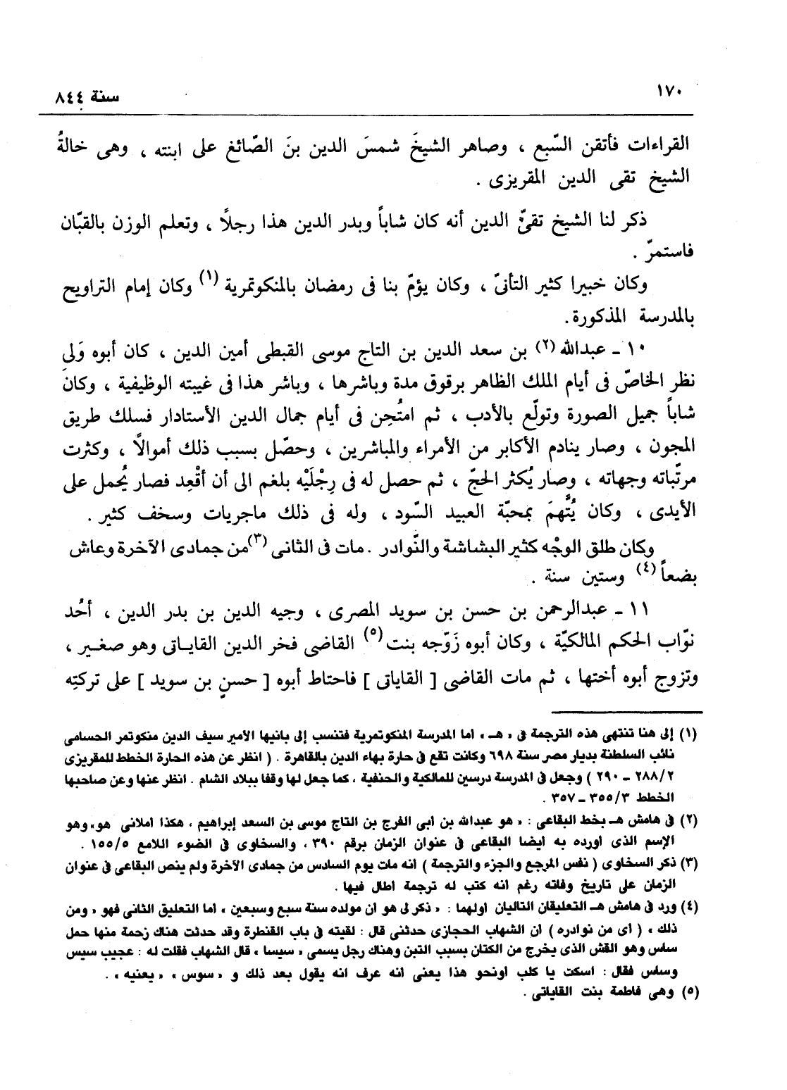 القراآت فأتقن السبع، وصاهر الشيخ شمس الدين ابن الصائغ على ابنته وهي خالة الشيخ تقي الدين المقريزي، وذكر لنا الشيخ تقي الدين أنه كان شاباً وبدر الدين هذا رجل، وتعلم الوزن بالقبان فاستمر، وكان خيراً كثير التأني، وكان يؤم بنا في رمضان بالمنكوتمرية.