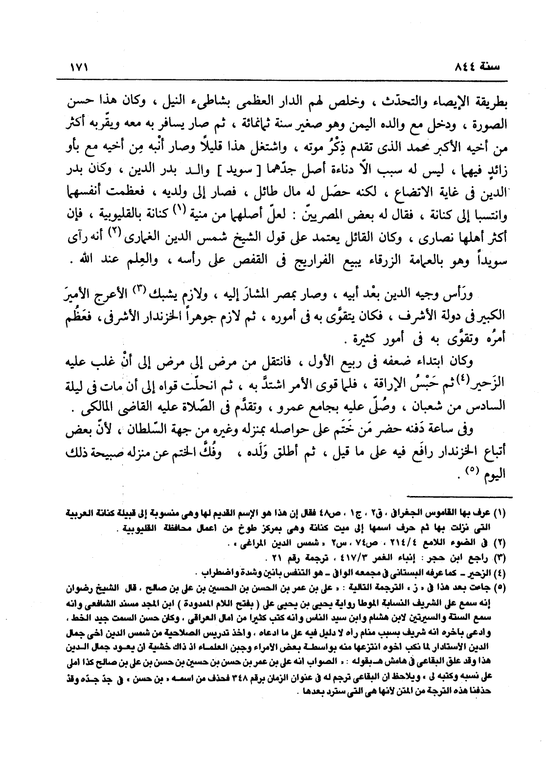 بطريق الإيصاء والتحدث، وخلص لهم الدار العظمى بشاطئ النيل، وكان هذا حسن الصورة، دخل مع والده اليمن وهو صغير سنة ثمانمائة، ثم صار يسافر به معه ويقربه أكثر من أخيه الأكبر محمد الذي تقدم ذكر موته، واشتغل هذا قليلاً وصار أنبه من أخيه مع بأو زائد فيهما، ليس له سبب إلا دناءة أصل جدهما والد بدر الدين. وكان بدر الدين في غاية التضاع لكنه حصل له مال طائل فصار إلى ولديه فعظمت أنفسهما وانتسبا إلى كنانة، فقال لي بعض المصريين: لعل أصلهما من منية كنانة بالقللوبية فإن أكثر أهلها نصارى، وكان القائل يعتمد على قول الشيخ شمس الدين الغماري أنه رأى سويداً وهو بالعمامة الزرقاء يبيع الفراريج والقفص على رأسه - والعلم عند الله! ورأس وجيه الدين بعد أبيه وصار المشار إليه بمصر، ولازم يشبك الأعرج الامير الكبير في دولة الأشرف فكان يتقوى به في أموره، ثم لازم جوهر الخازندار الأشرفي فعظم أمره وتقوى به في أمور كثيرة، وكان ابتداء ضعفه في ربيع الأول فانتقل من مرض إلى مرض إلى أن غلب عليه الزحير ثم حبس الإراقة، فلما قوي البرد اشتد به ثم انحلت قواه إلى أن مات في ليلة السادس من شعبان، وصلى عليه بجامع عمرو؛ وتقدم في الصلاة عليه القاضي المالكي، في ساعة دفنه حضر من ختم على حواصله في منزله وغيره من جهة السلطان، لأن بعض أتباع الخازندار رافع فيه على ما قيل، ثم أطلق ولده وفك الختم على منزله صبيحة ذلك اليوم.