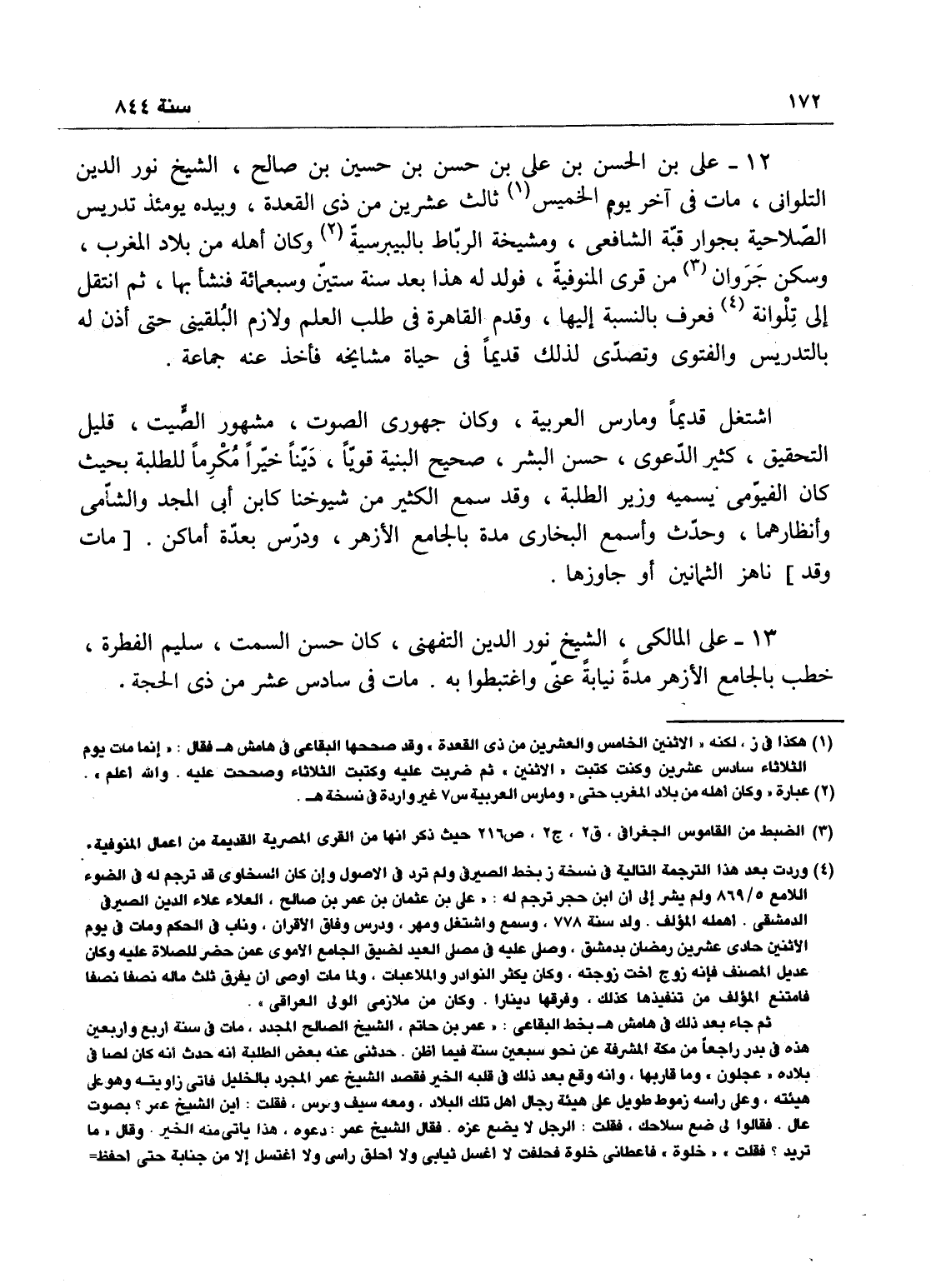 علي بن الحسن بن عمر نور الدين التلواني، مات في آخر يوم الاثنين الخامس ولعشرين من ذي القعة، وبيده يومئذ تدريس الصالحية بجوار قبة الشافعي ومشيخة الرباط بالبيبرسية، وكان أصله من بلاد المغرب، وسكن الحسن حزوان من قرى المنوفية فولد له على هذا بعد ستين وسبعمائة فنشأ بها، ثم انتقل إلى تلوانة وعرف بالنسبة إليها، وقدم القاهرة فطلب العلم، ولازم البلقيني حتى أذن له بالتدريس والفتوى، وتصدى لذلك قديماً في حياة مشايخه، فاخذ عنه جماعة، ومارس العربية - اشتغل قديماً، وكان جهوري الصوت، مشهور الصيت، قليل التحقيق، كثير الدعوى، حسن البشر، صحيح البنية، قوياً ديناً خيراً - مكرماً للطلبة بحيث كان الفيومي يسميه وزير الطلبة، وقد سمع الكثير من شيوخنا كان أبي المجد والشامي وأنظارهما. وحدث، وأسمع البخاري مدة بالجامع الأزهر، ودرس بعدة أماكن، وناهز الثمانين أو جاوزها.