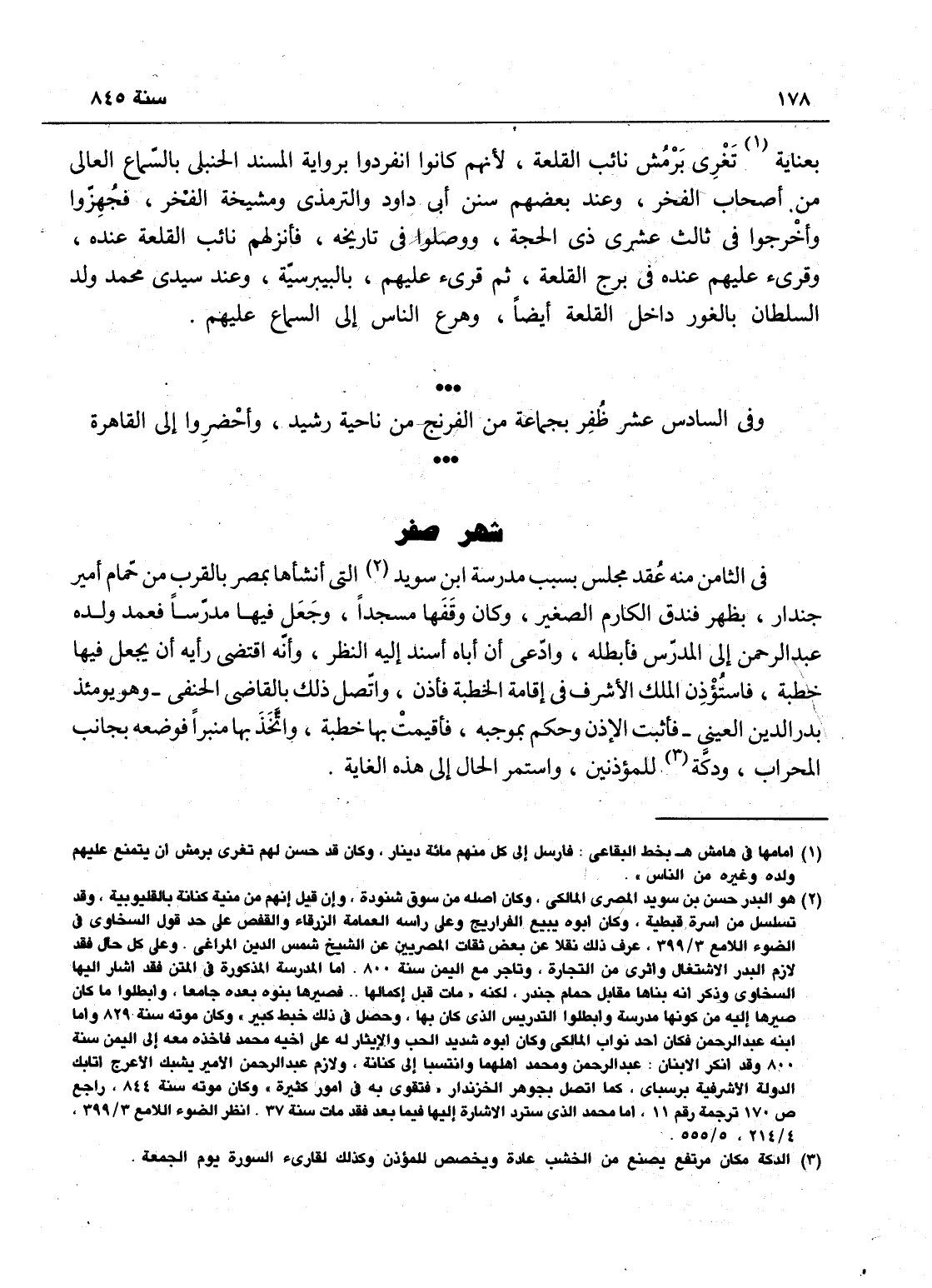 صفر الأغر - في الثامن منه عقد مجلس بسبب مدرسة ابن السويد التي أنشأها بمصر بالقرب من حمام أمير جندار بظهر فندق الكارم الصغير، وكان وقفها مسجداً وجعل فيها مدرساً، فعمد ولده عبد الرحمن إلى المدرس فأبطله، وادعى أن أباه اسند إليه النظر وأنه اقتضى رأيه أن يجعل فيها خطبة، فاستؤذن الملك الأشرف في إقامة الخطبة فأذن، واتصل ذلك بالقاضي الحنفي وهو يومئذ بدر الدين العيني فأثبت الإذن وحكم بموجبه، فأقيمت بها خطبة، واتخذ لها منبراً فوضعه بجانب المحراب ودكة للمؤذنين، واستمر الحال إلى هذه الغاية،