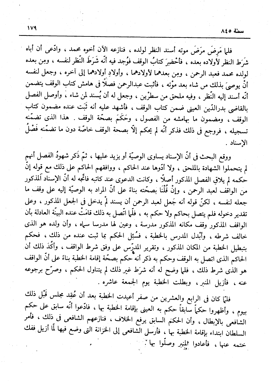 فلما اتصل به ذلك قامت عنده البينة العادلة بأن الواقف المذكور وقف مكانه المذكور مدرسة وعين لها مدرساً سماه، وأن ولده هو الذي خالف شرطه وأبدل المدرس بالخطبة، فسئل الحكم بما ثبت عنده من ذلك فحكم بتبطيل الخطبة من المكان المذكور وتقرير المدرس على وفق شرط الواقف، وأكد ذلك أن الحاكم الذي اتصل به الوقف وحكم به ذكر أن حكمه بصحة إقامة الخطبة بناه على أن الواقف هو الذي شرط ذلك، فلما وضح له أنه شرط غير ذلك لم يتناوله الحكم وصرح برجوعه منه، فأزيل المنبر وبطلب الخطبة يوم الجمعة عاشره، فلما كان في الرابع والعشرين من صفر أعيدت الخطبة بعد أن عقد مجلس قبل ذلك بيوم، وأظهروا حكماً سابقاً حكم به العينين بإقامة الخطبة بها، فادعوا أنه سابق على حكم الشافعي بالإبطال وأن الحكم السابق يرفع الخلاف، فنازعهم الشافعي في ذلك، فأمر السلطان ابتداء بإقامة الخطبة، فأرسل الشافعي إلى الخزانة التي وضع فيها المنبر لما أزيل، ففك ختمه عنها فأعادوا المنبر وصلوا بها.