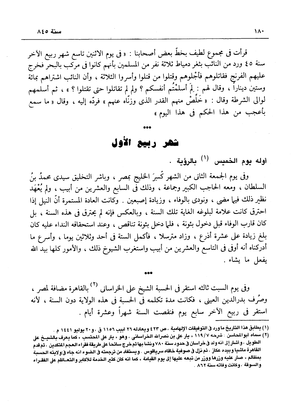 وفي يوم الجمعة الثاني من الشهر كسر الخليج بمصر، وباشر التخليق سيدي محمد بن السلطان ومعه الحاجب الكبير وجماعة، وذلك في السابع والعشرين من أبيب، ولم يعهد نظير ذلك فيما مضى، ونودي بالوفاء وزيادة إصبعين، وكانت العادة المستمرة أن النيل إذا احترق كانت علامة لبلوغه الغاية تلك السنة وبالعكس، فلم يحترق في هذه السنة بل كان قارب الوفاء قبل دخوله بونة، فلما دخل بونة تناقص، وعند استحقاق النداء عليه كان بلغ زيادة على عشرة اذرع، وزاد مترسلاً فأكمل الستة في أحد وثلاثين يوماً، وأسرع ما أدركناه أنه أوفى في التاسع والعشرين من أبيب، واستغرب الشيوخ ذلك - والأمور كلها لله يفعل ما يشاء.