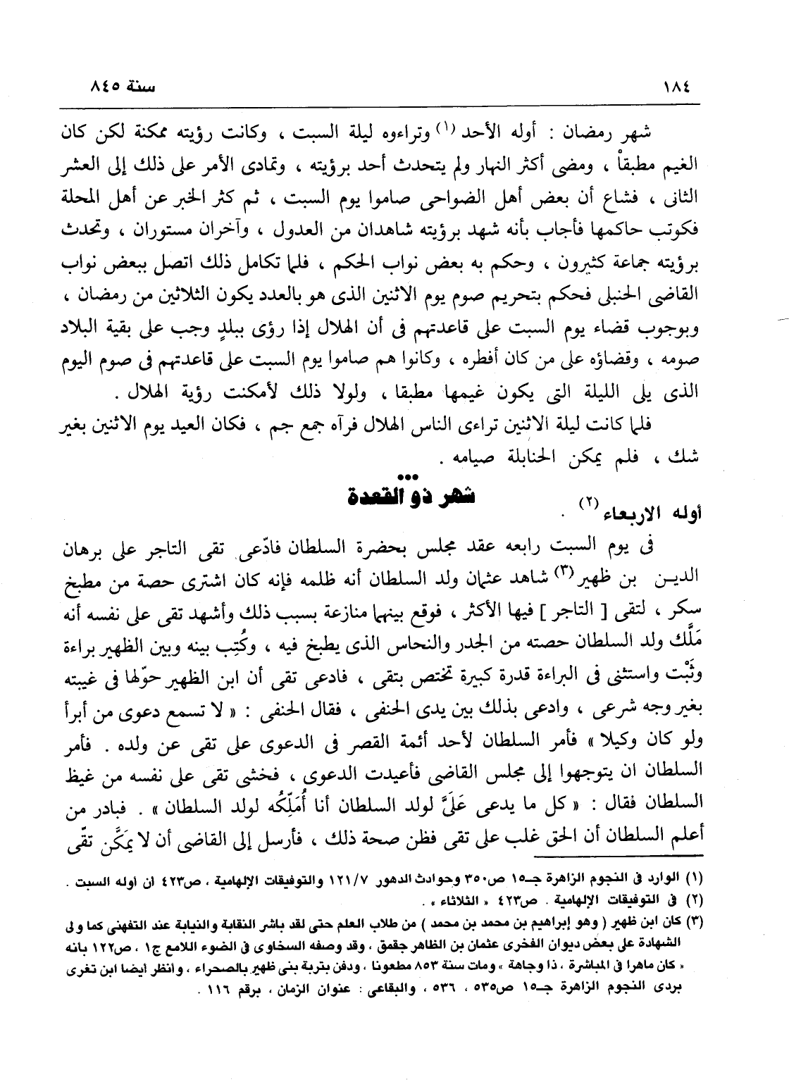 شهر - ذي القعدة الحرام أوله - الأربعاء في يوم السبت رابعه عقد مجلس بحضرة القضاة - فادعى تقي التاجر على برهان الدين بن ظهير شاهد عثمان ولد السلطان أنه ظلمه، فإنه كان اشترى حصة من مطبخ سكر لتقي فيها الأكثر فوقع بينهما منازعة بسبب ذلك.