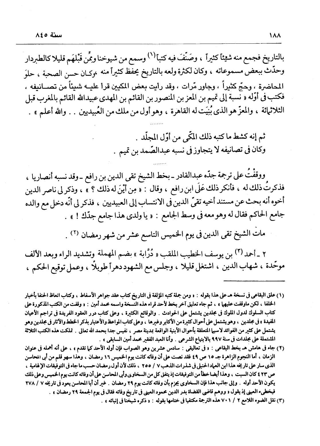 بالتاريخ فجمع منه شيئاً كثيراً وصنف فيه كتباً، وسمع من شيوخنا وممن قبلهم قليلاً كالطبردار وحدث ببعض مسموعاته، وكان لكثرة ولعه بالتاريخ يحفظ كثيراً منه، وكان إماماً بارعاً مفنناً متقناً ضابطاً ديناً خيراً، محباً لأهل السنة يميل إلى الحديث والعمل به حتى نسب إلى الظاهر - حسن الصحبة، حلو المحاضرة، وحج كثيراً واور مرات، وقد رأيت بعض المكيين قرأ عليه شيئاً من تصانيفه فكتب في أوله نسبه إلى تميم ابن المعز بن المنصور بن القائم بن المهدي عبيد الله القائم بالمغرب قبل الثلاثمائة، والمعز هو الذي بنيت له القاهرة وهو أول من ملك من العبيديين - فالله أعلم، ثم إنه كشط ما كتبه ذلك المكي من أول المجلد، وكان في تصانيفه لا يتجاوز في نسبه عبد الصمد بن تميم، ووقفت على ترجمة جده عبد القادر بخط الشيخ تقي الدين بن رافع وقد نسبه أنصارياً فذكرت ذلك له، فأنكر ذلك على ابن رافع وقال: من أين له ذلك! وذكر لي ناصر الدين أخوه أنه بحث عن مستند أخيه تقي الدين في الانتساب إلى العبيديين، ذكر له أنه دخل مع والده جامع الحاكم فقال له وهو معه في وسط الجامع: يا ولدي! هذا جامع جدك؛ مات الشيخ تقي الدين في يوم الخميس سابع عشري شهر رمضان.