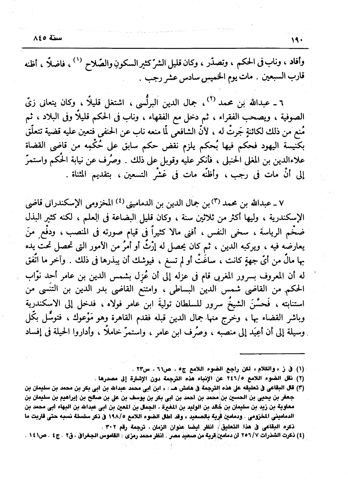 عبد الله بن محمد جمال الدين البرلسي، اشتغل قليلاً وكان يتعانى بزي الصوفية ويصحب الفقراء ثم دخل مع الفقهاء، وناب في الحكم قليلاً في بعض البلاد -، ثم منع من ذلك لكائنة جرت له لأن الشافعي لما منعه ناب عند الحنفي، فعين عليه قضية تتعلق بكنيسة اليهود، فحكم فيها بحكم يلزم نقض حكم سابق على حكمه من قاضي القضاة علاء الدين بن المغلي الحنبلي، فأنكر عليه وقوبل على ذلك وصرف عن نيابة الحكم واستمر إلى أن مات في رجب، وأظنه مات في عشر التسعين - بتقديم المثناة.