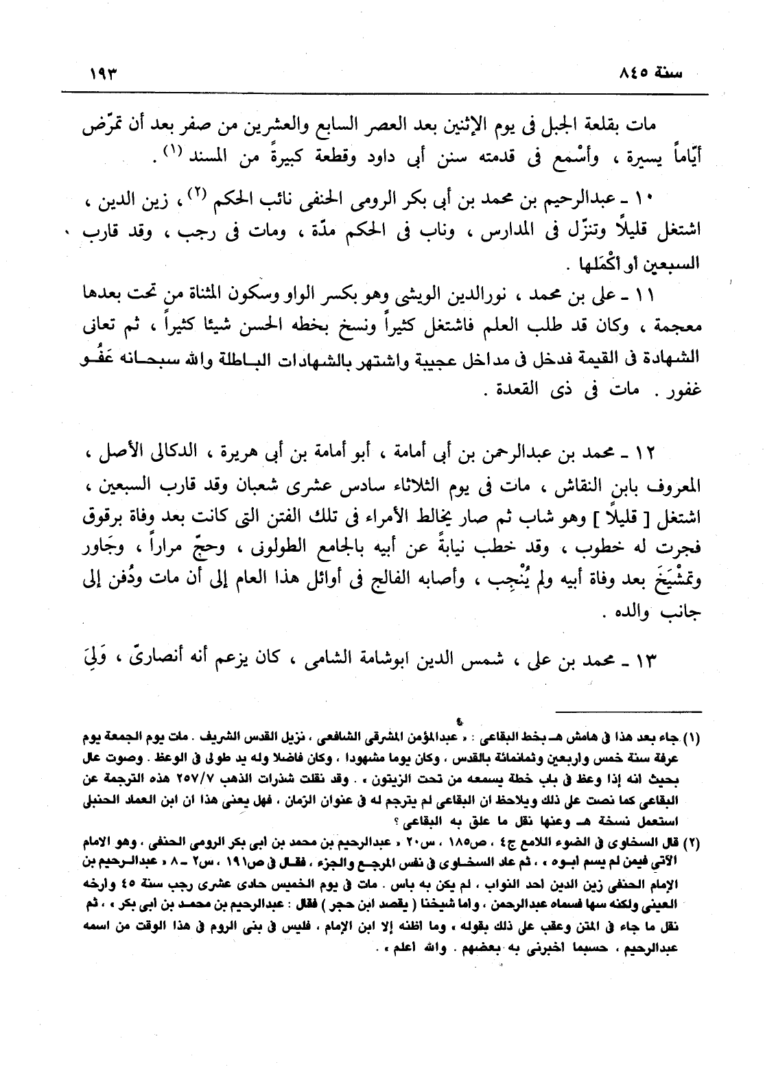علي بن محمد نور الدين الويشي - وهو بكسر الواو وسكون المثناة من نحت بعدها معجمة، وكان قد طلب العلم فاشتغل كثيراً ونسخ بخطه الحسن شيئاً كثيراً، ثم تعاني الشهادة في القيمة فدخل في مداخل عجيبة واشتهر بالشهادات الباطلة - والله سبحانه عفو غفور! مات في ذي القعدة. محمد بن عبد الرحمن بن أبي أمامة أبو أمامة بن أبي هريرة الدكالي الأصل المعروف بابن النقاش، مات في يوم الثلاثاء سادس عشري شعبان وقد قارب السبعين، اشتغل قليلاً وهو شاب، ثم صار يخالط الأمراء في تلك الفتن التي كانت بعد وفاة برقوق فجرت له خطوب، وقد خطب نيابة عن ابيه بالجامع الطولوني، وحج مراراً وجاور، وتمشيخ بعد وفاة والده ولم ينجب وأصابه الفالج في أوائل هذا العام إلى أن مات به، ودفن إلى جانب والده.