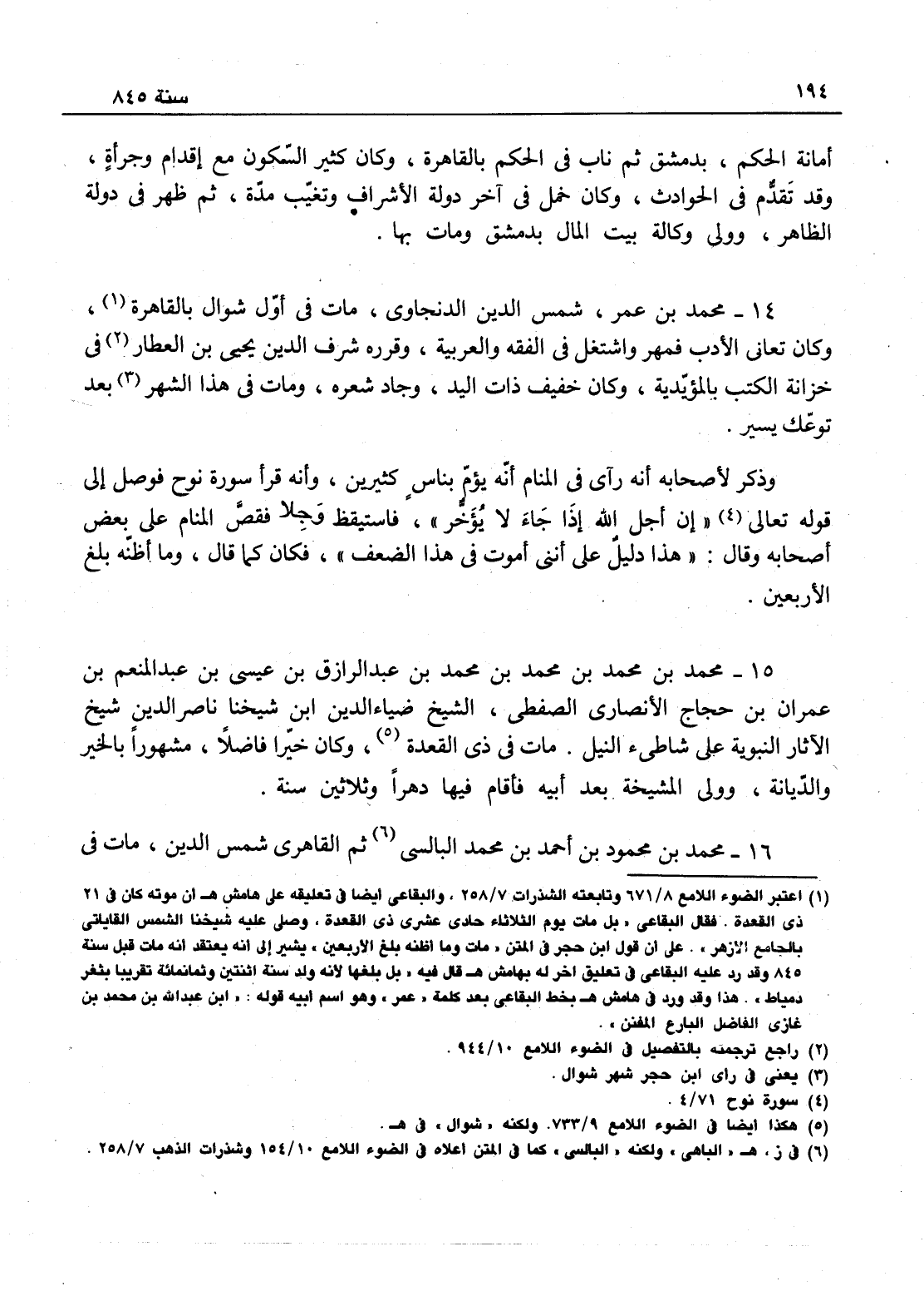 نيابة الحكم بدمشق ثم ناب في الحكم بالقاهرة، وكان كثير السكون مع إقدام وجرأة - وقد تقدم منا في الحوادث، وكان خمل في آخر دولة الأشرف وتغيب مدة، ثم ظهر في دولة الظاهر وولي وكالة بيت المال بدمشق، ومات بها. محمد بن عمر شمس الدين الدنجاوي، مات في أول شوال بالقاهرة وكان تعانى الأدب فمهر، واشتغل في الفقه والعربية، وقرره شرف الدين يحيى بن العطار في خزانة الكتب بالمؤيدية، وكان خفيف ذات اليد، وجاد شعره، ومات في هذا الشهر بعد توعك يسير، وذكر لأصحابه أنه رأى في المنام أنه يؤم بناس كثيرة وأنه قرأ سورة نوح ووصل إلى قوله تعالى إن أجل الله إذا جاء لا يؤخر فاستيقظ وجلا فقص المنام على بعض أصحابه وقال: هذا دليل أنني أموت في هذا الضعف، فكان كما قال، وما أظنه بلغ الأربعين.