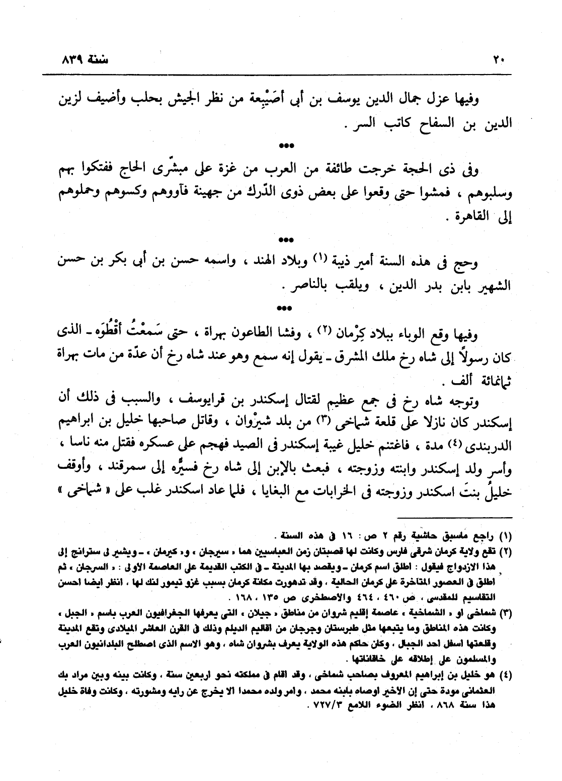 وفيها وقع الوباء ببلاد كرمان وفشا الطاعون بهراة حتى سمعت اقطعوه الذي كان رسولا إلى شاه رخ ملك الشرق يقول - إنه سمع وهو عند شاه رخ أن عدة من مات بهراة ثمانمائة ألف. وتوجه شاه رخ في جمع عظيم لقتال اسكندر بن قرا يوسف، والسبب في ذلك أن اسكندر كان نازل قلعة شماخي من بلد شروان وقاتل صاحبها خليل ابن إبراهيم الدربندي مدة، فاغتنم غيبة اسكندر في الصيد فهجم على عسكره فقتل منهم ناساً واسر ولد اسكندر وابنته وزوجته، فبعث بالابن إلى شاه رخ فسيره إلى سمرقند، ووقف خليل بنت اسكندر وزوجته في الخرابات مع البغايا، فلما عاد اسكندر غلب على شماخي