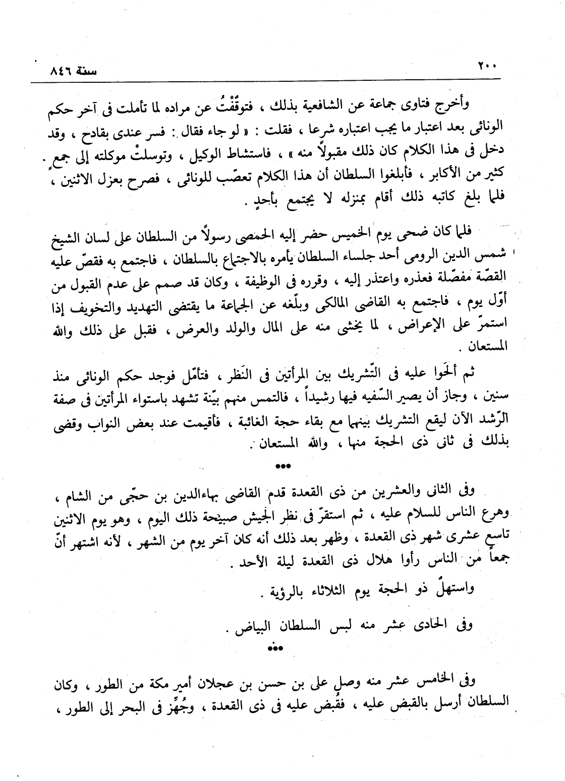 وأخرج فتاوى جماعة من الشافعية بذلك، فتوقفت عن مراده لما تأملت في آخر حكم الونائي بعد اعتبار ما يجب اعتباره شرعاً فقلت: لو جاء فقال: فسر عندي بقادح وقد دخل في هذا الكلام كان مقبولاً منه، فاستشاط الوكيل وتوسلت موكلته إلى جمع كثير من الأكابر، فأبلغوا السلطان أن هذا الكلام تعصب للونائي، فصرح بعزل الاثنين، فلما بلغ كاتبه ذلك أقام بمنزله لا يجتمع بأحد، فلما كان ضحى يوم الخميس حضر إليه الحمصي رسولاً من السلطان على لسان الشيخ شمس الدين الرومي أحد جلساء السلطان فأمره بالاجتماع بالسلطان، فاجتمع به - فقص عليه القصة مفصلة، فعذره واعتذر إليه وقرره في الوظيفة، وكان قد صمم على عدم القبول من أول يوم، فاجتمع به القاضي الماضي المالكي وبلغه عن الجماعة ما يقتضي التخويف والتهديد إذا استمر على الإعراض بما يخشى منه على المال والد والعرض، فقبل على ذلك - والله المستعان؛ ثم ألحوا عليه في التشريك بين المرأتين في النظر، فتأمل - فوجد حكم الونائي منذ سنين وجاز أن يصير السفيه فيها رشيداً، فالتمس منهم بينة تشهد باستواء المرأتين في صفة الرشد الآن ليقع التشريك بينهما مع بقاء حجة الغائبة، فاقيمت عند بعض النواب، وقضى بذلك في ثاني ذي الحجة منها - والله المستعان.