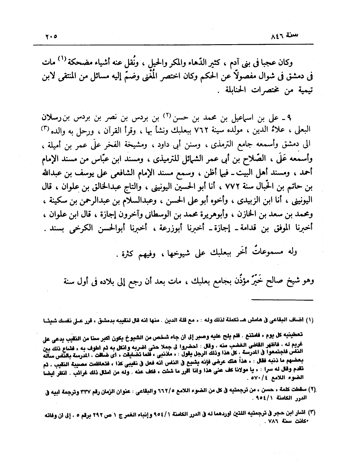 علي بن إسماعيل بن محمد بن بردس بن نصر بن بردس بن رسلان البعلي علاء الدين، مولده سنة 762 ببعلبك ونشا بها وقرأ القرآن، ورحل به والده إلى دمشق واسمعه جامع الترمذي وسنن أبي داود ومشيخة الفخر على أبي حفص عمر بن أميلة، وأسمعه على الصلاح ابن أبي عمر الشمائل للترمذي ومسند ابن عباس من مسند الإمام أحمد ومسند أهل البيت فيما أظن، وسمع مسند الإمام الشافعي على يوسف بن عبد الله ابن حاتم بن الحبال سنة 772 أنا أبو الحسن اليونيني والتاج عبد الخالق ابن علوان، قال اليونيني: أنا ابن الزبيدي وأخوه أبو علي الحسن وعبد السلام ابن عبد الرحمن بن سكينة ومحمد بن سعد بن الخازن وأبو هريرة محمد ابن الوسطاني وآخرون إجازة؛ ح وقال ابن علوان: أنا الموفق بن قدامة إجازة نا أبو زرعة أنا أبو الحسن الكرخي بسنده، وله مسموعات آخر ببعلبك على شيوخها وفيهم كثرة، وهو شيخ صالح خير مؤذن بجامع بعلبك، مات بعد أن رجع إلى بلاده في أول سنة