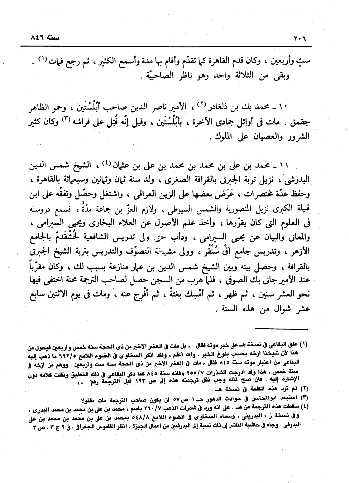محمد بك بن دلغادر الأمير ناصر الدين صاحب الأبلستين وحمو الملك الظاهر جقمق، مات في أوائل جمادى الآخرة بالأبلستين، وقيل إنه قتل على فراشه، وكان كثير الشرور والعصيان على الملوك -.