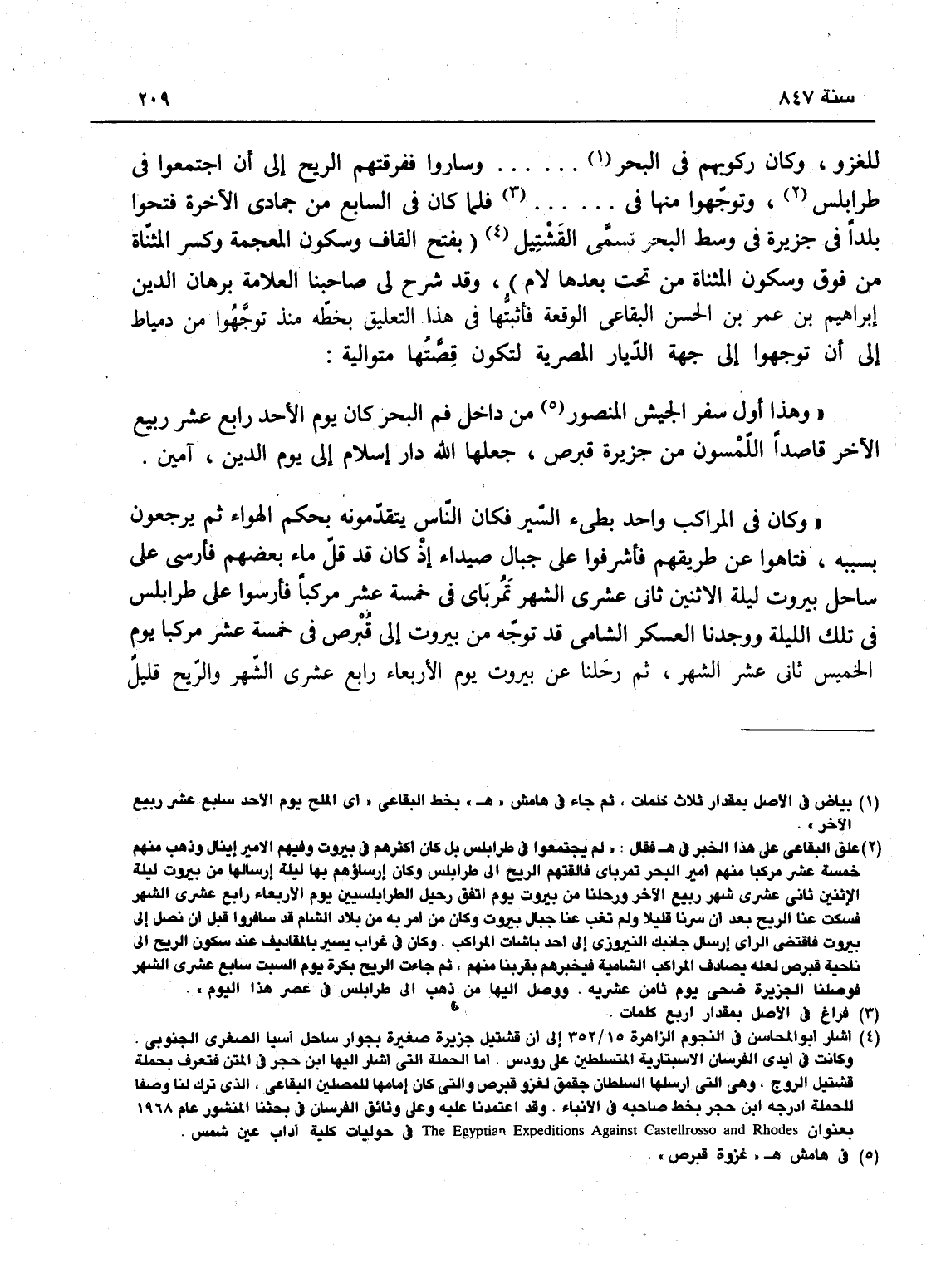 وقد شرح لي صاحبنا العلامة إبراهيم بن عمر بن الحسن البقاعي الوقعة وأثبتها في هذا التعليق بخطه منذ توجهوا من دمياط إلى أن توجهوا إلى جهة الديار المصرية ليكون قصتها متوالية، وهذا اوان سفر الجيش المنصور من داخل فم البحر الملح كان يوم الأحد رابع عشر شهر ربيع الآخر قاصداً اللمسون من جزيرة قبرس - جعلها الله دار إسلام إلى يوم الدين! آمين.