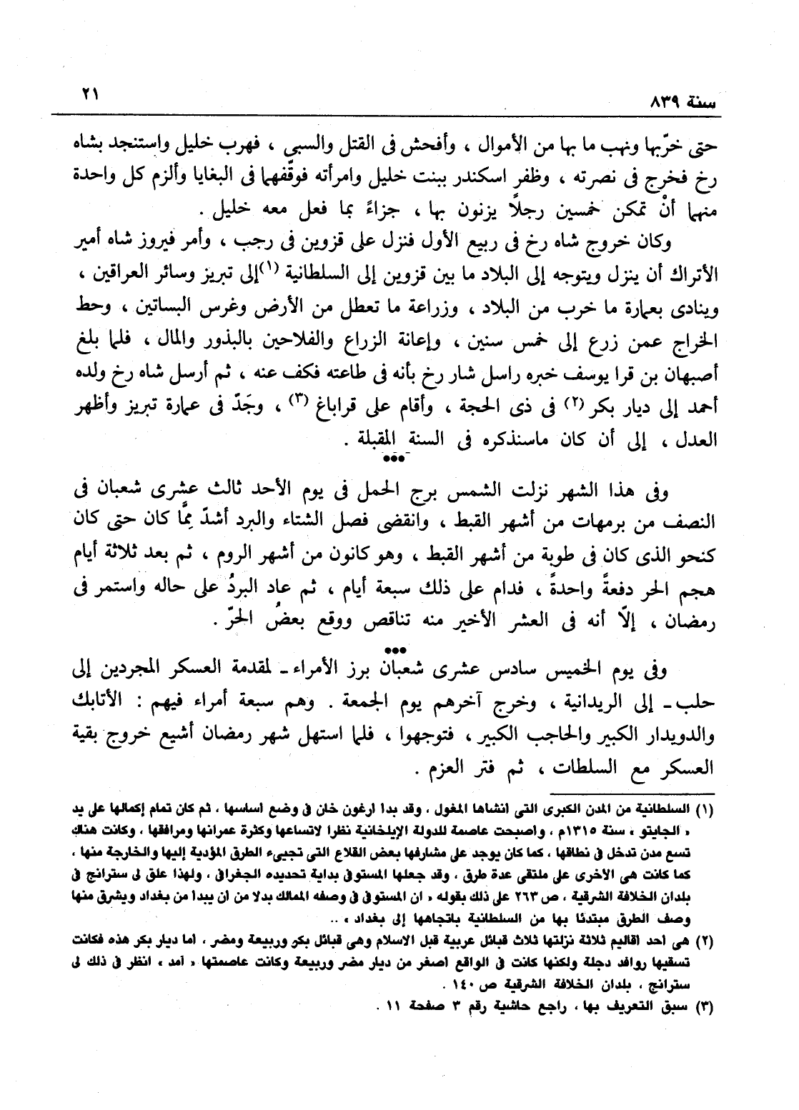 حتى خربها ونهب ما بها من الأموال وأفحش في القتل والسبي، فهرب خليل واستنجد بشاه رخ فخرج في نصرته، وظفر اسكندر ببنت خليل وامرأته فوقفهما في البغايا، وألزم واحدة منهما أن تمكن خمسين رجلاً يزني بها جزاء ما فعل خليل، وكان خروج شاه رخ في ربيع الأول فنزل على قزوين في رجب، وأمر فيروز شاه أمير الأتراك أن يتوجه إلى البلاد ما بين قزوين إلى السلطانية إلى تبريز وسائر العراقين وينادي بعمارة ما خرب من البلاد وزراعة ما تعطل من الأرض وغراس البساتين وحط الخراج عمن زرع إلى خمس سنين وإعانة الزراع والفلاحين بالبذر والمال.