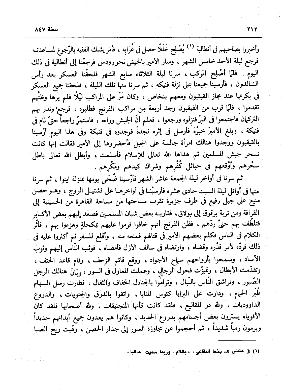 عاصف فرقهم وضعضع بعضهم، فاجتمعوا إلا اثنين: أحدهما لم يقعوا له على خبر والثاني أخبروا انه في أنطاكيا يصلح خللاً حصل في غرابه، فأمر يشبك الفقيه بالرجوع لمساعدته، فرجع ليلة الأحد خامس الشهر، وسار الأمير بالجيش نحو رودس، فرجعنا إلى أنطاكيا في ذلك اليوم، فلما أصلح المركب سرنا ليلة الثلاثاء سابع الشهر فلحقنا بعض العسكر عند رأس الشالدون فأرسينا جميعاً على منزلة فنيكة، ثم سرنا منها تلك الليلة فلحقنا جميع العسكر في بكرتها عند مجاز القيقبون ومعهم بتخاص وكان مر على المراكب ليلاً فلم يرها وظنهم تقدموا، فلما قرب من القيقبون وجدوا أربعة من مراكب الفرنج فطلبوه فرجع ونذر بهم التركمان، فاجتمعوا في البر فتركوه ورجعوا، فعلم أن الجيش وراءه فاستمر راجعاً حتى نام في فنيكة، وبلغ الأمير خبره فأرسل في أمره نجدة فوجدوه في فنيكة - وفي هذا اليوم أرسلنا بالقيقيون، ووجدوا هنالك امرأة جالسة على الجبل، فأحضروها إلى أمير فقالت: إنها كان تسحر جيش المسلمين ثم هداها الله تعالى إلى الإسلام فأسلمت، فأبطل الله تعالى باطل سحرهم، وأوقعهم في حبائل كفرهم وأشراك كيدهم ومكرهم - ثم سرنا في أواخر ليلة الجمعة عاشر الشهر فأرسينا ضحى يومها بمنزلة إينوا، ثم سرنا منها في أوائل ليلة السبت حادي عشره فأرسينا في أواخرها على قشتيل الروج، وهو حصن منيع على جبل رفيع في طرف جزيرة تقرب مساحتها من مساحة القاهرة من الحسينية إلى القرافة ومن تربة برقوق إلى بولاق فشارفه بعض شبان المسلمين فصعد إليهم بعض الأكابر فتلطف بهم حتى ردهم، فظن الفرنج انهم خافوا فرموا عليهم بمكحلة وهزأوا بهم، فأثر الكلام في الناس فكلم بعضهم الأمير في قتالهم فمنع منه وأقلع للسفر، ثم أكثروا عليه في ذلك فرده الله تعالى لأمر قدره وقضاه، وارتضاه في سالف الازل فأمضاه، فوثب الناس إليهم وثوب الآساد، وسمحوا بأرواحهم سماح الاجواد، ووقع قائم الزحف، وقام قاعد الحتف، وتقدمت الأبطال، وتميزت فحول الرجال، وعملت المعاول في السور، وبان هنالك الرجل الصبور، وتراشق الناس بالنبال، وتراموا بالجنادل الخفاف والثقال، فطارت رسل السهام، بمر شراب الحمام، ودارت على البرايا، كؤوس المنايا، وألقوا بالدرق والحنويات، والدروع الداوديات - ولله در المقاليع! فلقد كانت كأنها المناجيق - ولله أصحابها! فلقد كان الأقوياء يسترون بعض أجسامهم بدروع الحديد وكانوا هم يعدون جميع أبدانهم حديداً، ويرمون رمياً شديداً، ثم أحجموا عن مجاورة السور إلى جدار الحصن وهبت ريح الصبا