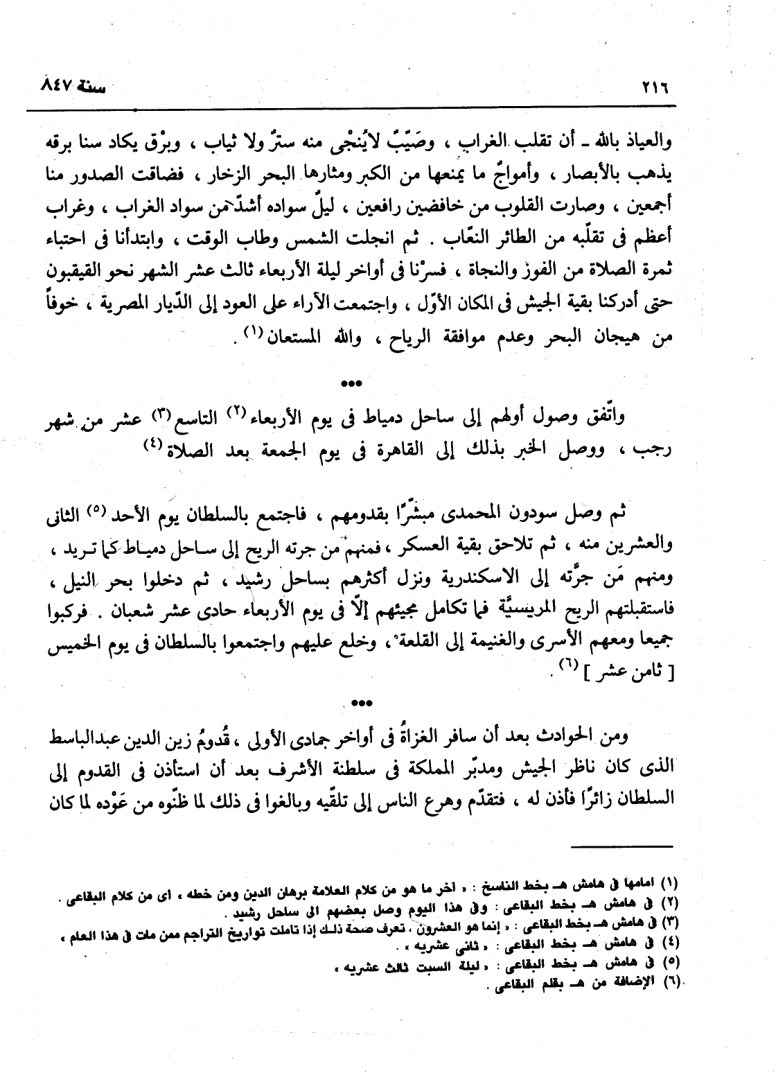 واتفق وصول أولهم إلى ساحل دمياط في يوم الأربعاء التاسع عشر من شهر رجب، ووصل الخبر بذلك إلى القاهرة في يوم الجمعة بعد الصلاة، ثم وصل سودون المحمدي مبشراً بقدومهم فاجتمع بالسلطان في يوم الاحد الثاني والعشرين منه، ثم تلاحق بقية العسكر، فمنهم من جرته الريح إلى ساحل دمياط كما تقدم، ومنهم من جرته إلى الإسكندرية، ونزل أكثرهم بساحل رشيد، ثم دخلوا بحر النيل فاستقبلهم الريح المريسية، فما تكامل مجيئهم إلا في يوم الأربعاء حادي عشر شعبان، فركبوا جميعاً ومعهم الأسرى والغنيمة إلى القلعة، وخلع عليهم، واجتمعوا بالسلطان يوم الخميس.