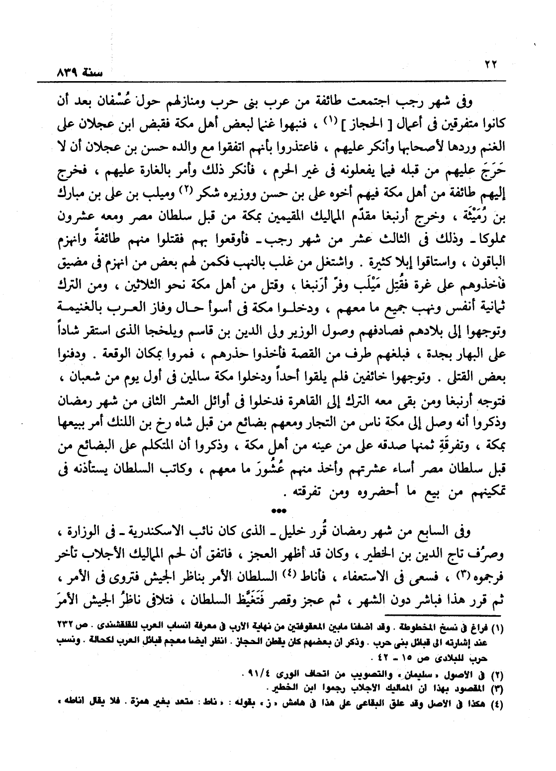 فاعتذروا بأنهم اتفقوا مع والده حسن بن عجلان إن لا حرج عليهم من قبله فيما يفعلونه في غير الحرم، فأنكر ذلك وأمر بالغارة عليهم، فخرج إليهم طائفة من أهل مكة منهم أخوه علي بن حسن ووزيره سليمان وميلب بن علي بن مبارك بن رميثة وخرج أرنبغا مقدم المماليك المقيمين بمكة من قبل سلطان مصر ومعه عشرون مملوكاً، وذلك في الثالث عشري من شهر رجب، فأوقعوا بهم فقتلوا منهم طائفة وانهزم الباقون واستاقوا إبلاً كثيرةً واشتغل من طلب النهب، فكمن لهم بعض من انهزم في مضيق فأخذوهم على غرة، فقتل ميلب وفر أرنبغا وقتل من أهل مكة نحو الثلاثين ومن الترك ثمانية أنفس ونهب جميع ما معهم ودخلوا مكة في أسوأ حال، وفاز العرب بالغنيمة وتوجهوا إلى بلادهم فصادفهم وصول الوزير وولي الدين بن قاسم ويلخجا الذي قرر شاداً على البهار بجدة، فبلغهم طرف من الفضة فأخذوا حذرهم، فمروا بمكان الوقعة فدفنوا بعض القتلى وتوجهوا خائفين فلم يلقوا أحداً ودخلوا مكة سالمين في أول يوم من شعبان، فتوجه أرنبغا ومن بقي معه من الترك إلى القاهرة، فدخلوها في أوائل العشر الثاني من شهر رمضان، وذكروا أنه وصل إلى مكة ناس من التجار ومعهم بضائع من قبل شاه رخ ابن اللنك أمر بيعها بمكة وتفرقتها فيها صدقة على من عينه من أهل مكة، وان المتكلم على البضائع من قبل سلطان مصر أساء عشرتهم وأخذ منهم عشور ما معهم وكاتب السلطان يستأذنه في تمكينهم من بيع ما أحضروه ومن تفرقته.