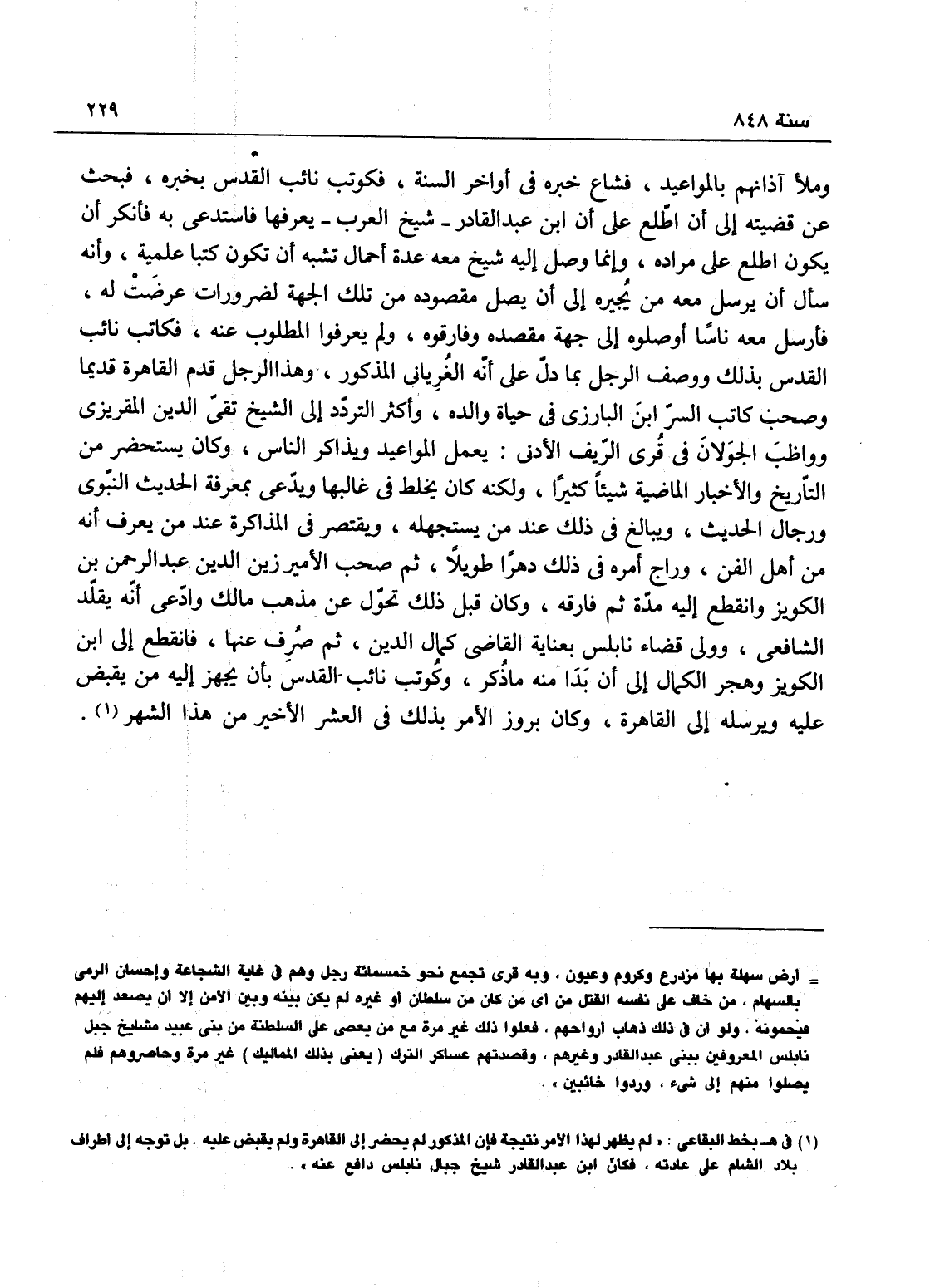 وملأ آذانهم بالمواعيد، فشاع خبره في آخر السنة فكوتب نائب القدس يخبره فبحث عن قضيته إلى أن أطلع أن ابن عبد القادر شيخ العرب يعرفه فاستدعى به فأنكر أن يكون أطلع على مراده، وإنما وصل إليه شيخ معه عدة جمال يشبه أن تكون كتباً علمية، وأنه سئل أن يرسل معه من يجيره إلى أن يصل إلى مقصوده من تلك الجهة لضرورات عرضت له، فأرسل معه ناساً أوصلوه إلى جهة مقصده وفارقوه ولم يعرفوا المطلوب عنه؛ فكاتب نائب القدس بذلك ووصف الرجل بما دل على أنه الفرياني المذكور، وهذا الرجل قدم القاهرة قديماً وصحب كاتب السر ابن البارزي في حياة والده، وأكثر التردد إلى الشيخ تقي الدين المقريزي، وواظب الجولان في قرى الريف الأدنى يعمل المواعيد ويذكر الناس، وكان يستحضر من التاريخ والاخبار الماضية شيئاً كثيراً ولكنه كان يخلط في غالبها ويدعي معرفة الحديث النبوي ورجال الحديث، ويبالغ في ذلك عند من يستجهله، ويقصر في المذاكرة عند من يعرف أنه من أهل الفن، وراج أمره في ذلك دهراً طويلاً، ثم صحب الأمير زين الدين عبد الرحمن بن الكويز وانقطع إليه مدة ثم فارقه، وكان قبل ذلك تحول عن مذهب مالك وادعى أنه يقلد الشافعي، وولي قضاء نابلس بعناية القاضي كمال الدين ثم صرف عنها، فانقطع إلى ابن الكويز وهجر الكمال إلى أن بدا ما ذكر؛ وكوتب نائب القدس بأن يجهز إليه من يقبض عليه ويرسله إلى القاهرة، وكان بروز الأمر بذلك في العشر الأخير من هذا الشهر.