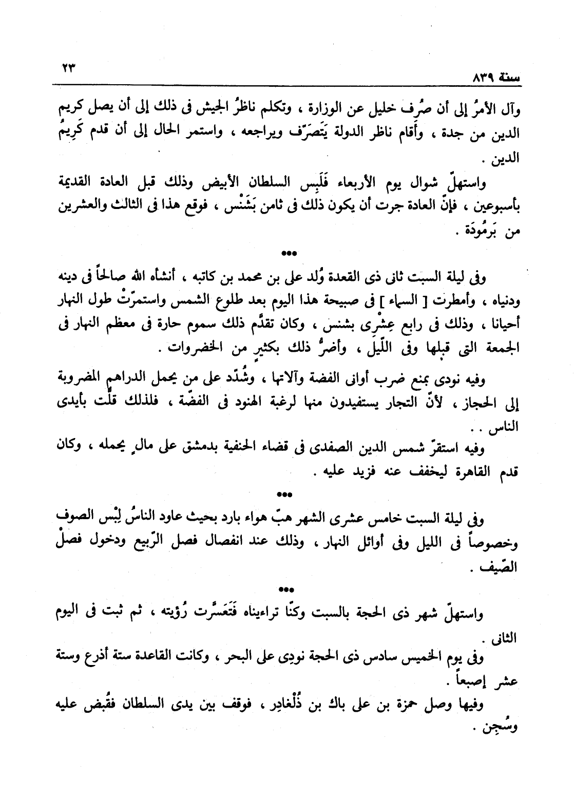 وفي ليلة السبت ثاني ذي القعدة ولد علي بن محمد ابن كاتبه، أنشأه الله صالحاً في دينه ودنياه، وأمطرت في صبيحة هذا اليوم بعد طلوع الشمس واستمر في طول النهار أحياناً، وذلك في رابع عشري بشنس، وكان تقدم قبل ذلك سموم حارة في معظم النهار في الجمعة التي قبلها وفي الليل واضر ذلك بكثير من الخضراوات. وفيه نودي بمنع ضرب أواني الفضة وآلاتها، وشدد على من يحمل الدراهم المضروبة إلى الحجاز، لان التجار يستفيدون فيها لرغبة الهنود في الفضة فلذلك قلت بأيدي الناس.