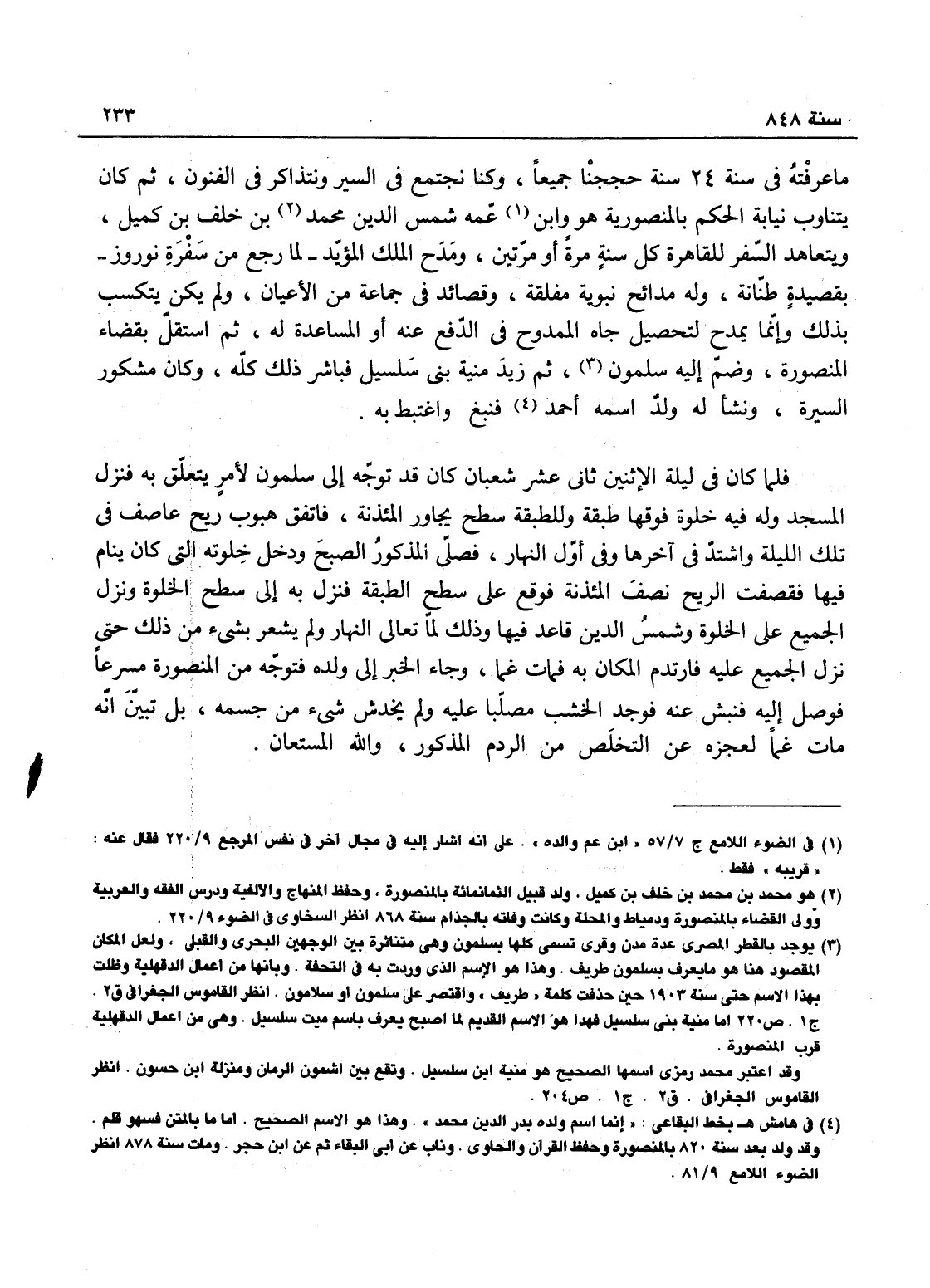 ما عرفته في سنة 24، حججنا جميعاً وكنا نجتمع في السير ونتذاكر في الفنون. ثم كان يتناوب نيابة الحكم بالمنصورة هو وابن عمه شمس الدين محمد بن خلف بن كميل، ويتعاهد السفر للقاهرة في كل سنة مرة أو مرتين ومدح الملك المؤيد لما رجع من سفرة نوروز بقصيدة طنانة، وله مدائح نبوية مفلقة وقصائد في جماعة من الأعيان، ولم يكن يتكسب بذلك وإنما يمدح لتحصيل جاه الممدوح في الدفع عنه أو المساعدة له، ثم استقل بقضاء المنصورة وضم إليه سلمون، ثم زدته منية بني سلسيل فباشر ذلك كله، وكان مشكور السيرة، ونشأ له ولد اسمه أحمد فنبغ واغتبط به، فلما كان في ليلة الاثنين ثاني عشر شعبان كان قد توجه إلى سلمون لأمر يتعلق به فنزل المسجد، وله فيه خلوة فوقها طبقة وللطبقة سطح مجاور المئذذنة، فاتفق هبوب ريح عاصف في تلك الليلة واشتد في آخرها وفي آول النهار فصلى المذكور الصبح ودخل خلوته التي كان ينام فيها، فقصف الريح نصف المئددنة فوقع على سطح الطبقة فنزل به إلى سطح الخلوة فنزل الجميع على الخلوةو وشمس الدين قاعد فيها، وذلك لما تعالى النهار ولم يشعر بشيء من ذلك حتى نزل الجميع عليه فارتدم المكان به فمات غماً، وجاء الخبر إلى ولده فتوجه من المنصورة مسرعاً فوصل إليه فنبش عنه، فوجد الخشب مصلباً عليه ولم يخدش شيئاً من جسمه، بل تبين أنه مات غماً لعجزه عن التخلص من الردم المذكور - والله المستعان.