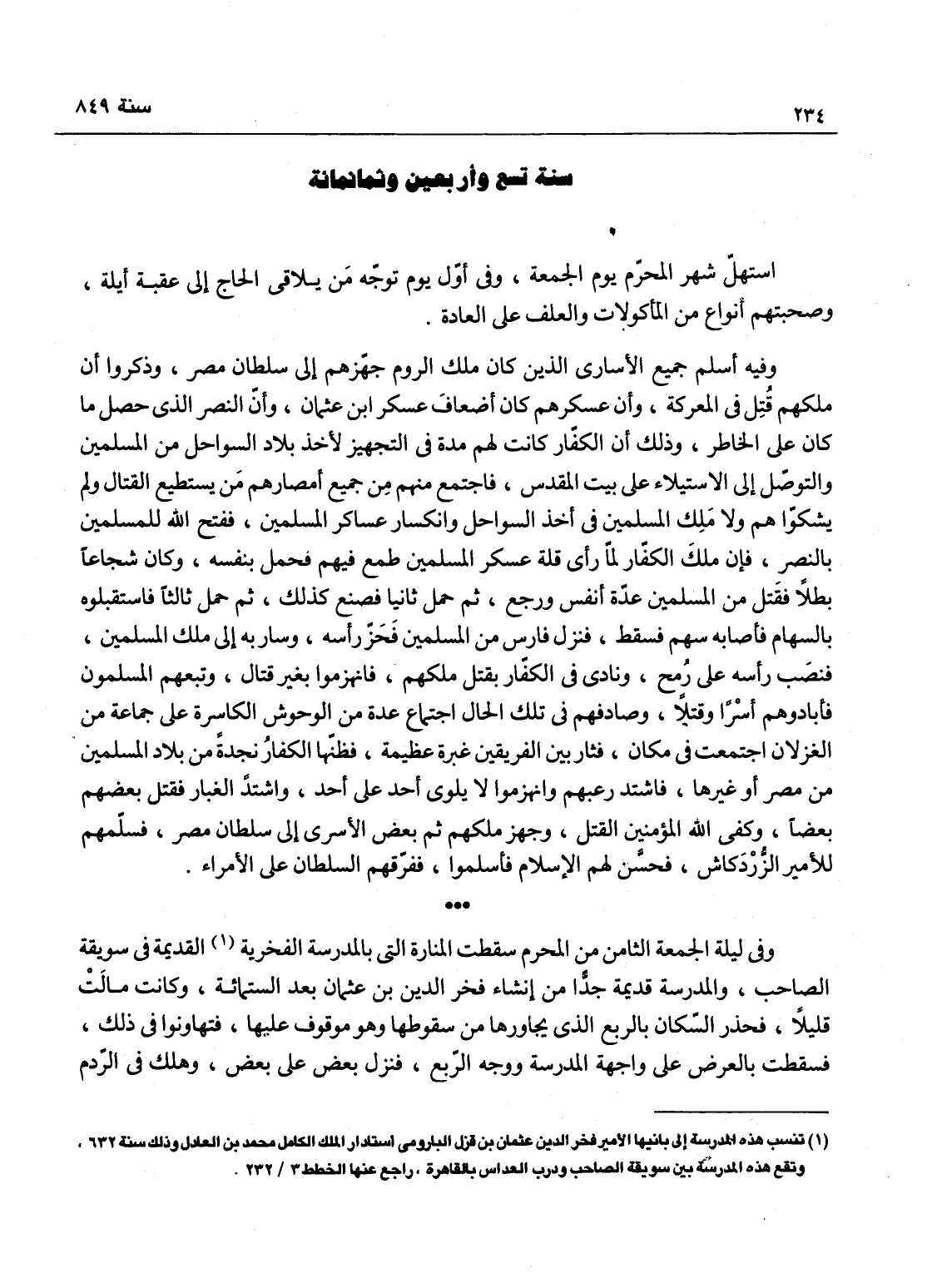وفيه أسلم جميع الأساري الذين كان ملك الروم جهزهم إلى سلطان مصر، وذكروا أنهم من بني الأصفر -، وأن ملكهم قتل في المعركة، وأن عسكرهم كان أضعاف عسكر ابن عثمان، وأن النصر الذي حصل ما كان على الخاطر؛ وذلك أن الكفار كانت لهم مدة في التجهيز لأخذ بلاد السواحل من المسلمين والتوصل إلى الاستيلاء على بيت المقدس، فاجتمع منهم من جميع أمصارهم من يستطيع القتال، ولم يشكوا هم ولا ملك المسلمين في اخذ السواحل وانكسار عساكر المسلمين، ففتح الله للمسلمين بالنصر بأن ملك الكفار لما رأى قلة عسكر المسلمين طمع فيهم فحمل بنفسه وكان شجاعاً بطلاً، فقتل من المسلمين عدة أنفس ورجع، ثم حمل ثانياً فصنع ذلك، ثم حمل ثالثاً فاستقبلوه بالسهام فأصابه سهم فسقط، فنزل فارس من المسلمين فحز رأسه وسار به إلى ملك المسلمين، فنصب رأسه على رمح ونادى في الكفار بقتل ملكهم، فانهزموا بغير قتال وتبعهم المسلمون فبادروهم أسراً وقتلاً، وصادفهم في تلك الحالة اجتماع عدة من الوحوش الكاسرة على جماعة من الغزلان اجتمعت في مكان، فثار بين الفريقين غبرة عظيمة وظنها الكفار نجدة من بلاد المسلمين من مصر أو غيرها، فاشتد رعبهم وانهزموا لا يلوي أحد على أحد، واشتد الغبار فقتل بعضهم بعضاً وكفى الله المؤمنين القتال؛ وجهز ملكهم بعض الأسرى إلى سلطان مصر، فسلمهم للأمير الزردكاش فحسن لهم الإسلام فأسلموا، ففرقهم السلطان على الأمراء.