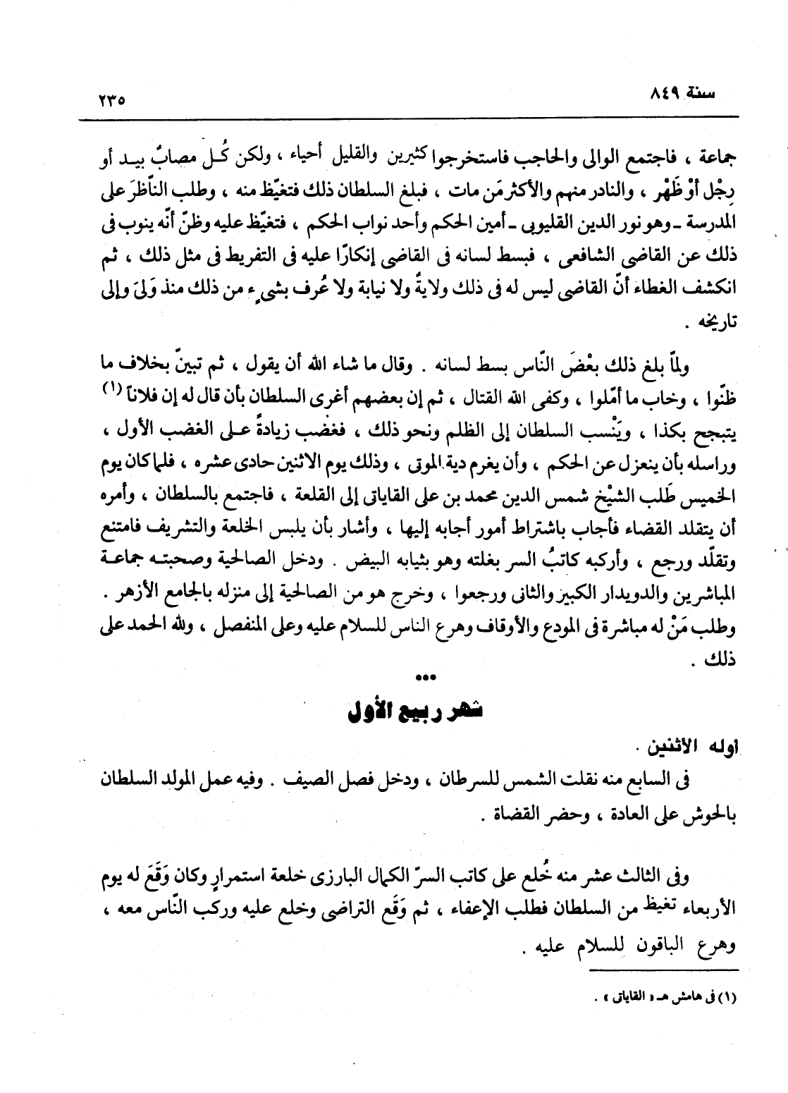 ربيع الأول - أوله الاثنين، في السابع منه نقلت الشمس السرطان ودخل فصل الصيف، وفيه عمل المولد السلطاني بالحوش على العادة وحضر القضاة.
