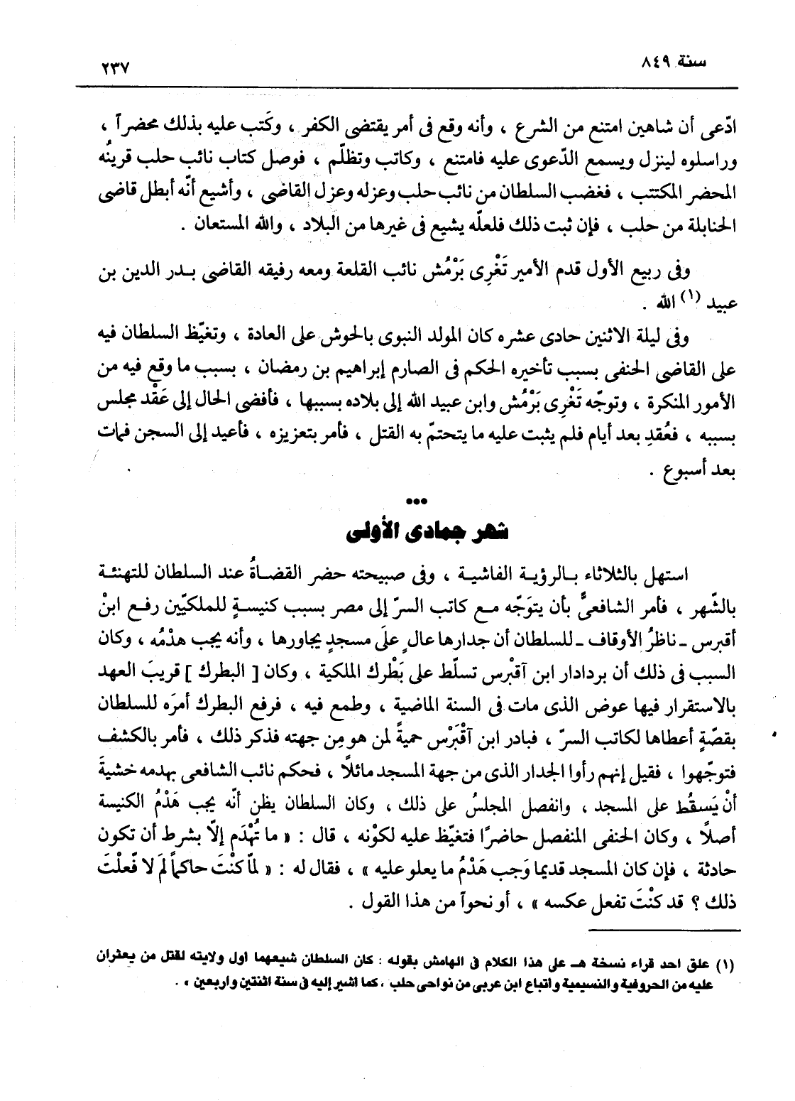 ادعى أن شاهين امتنع من الشرع وأنه وقع في أمر يقتضي الكفر وكتب عليه بذلك محضراً وراسلوه لينزل فسمع الدعوى عليه فامتنع وكاتب وتظلم، فوصل كتاب نائب حلب وقرينه المحضر المكتتب، فغضب السلطان من نائب حلب وعزله وعزل القاضي، وشيع أنه أبطل قاضي الحنابلة من حلب، فإن ثبت ذلك فلعله يسع غيرها من البلاد - والله المستعان.
