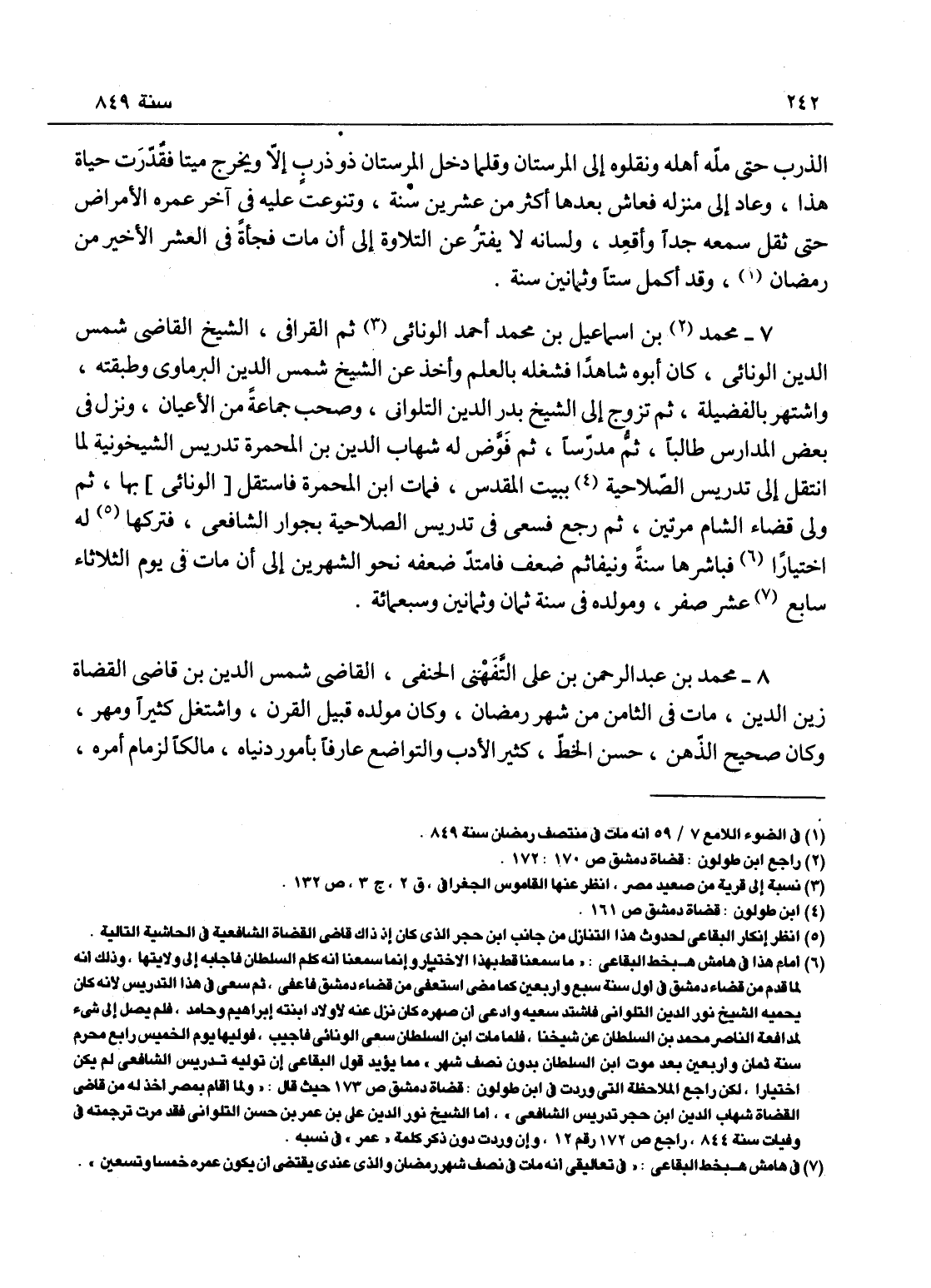 محمد بن عبد الرحمن بن علي التفهني الحنفي القاضي شمس الدين ابن - قاضي القضاة زين الدين، مات في الثامن من شهر رمضان وكان مولده قبل القرن، واشتغل كثيراً ومهر، وكان صحيح الذهن، حسن المحفوظ، كثير الأدب والتواضع، عارفاً بأمور دنياه، مالكاً لزمام أمره،