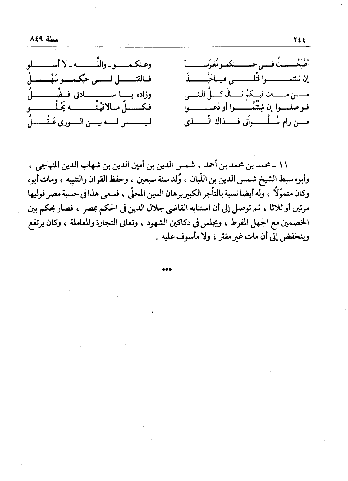 محمد بن محمد بن أحمد شمس الدين ابن أمين الدين بن شهاب الدين المنهاجي، وأبوه سبط الشيخ شمس الدين بن اللبان، ولد سنة سبعين وحفظ القرآن والتنبيه، ومات أبوه وكان متمولاً، وله أيضاً نسبة بالتاجر الكبير برهان الدين المحلي فسعى هذا في حسبة مصر فوليها مرتين أو ثلاثاً، ثم توصل إلى أن استنابه القاضي جلال الدين في الحكم بمصر، فصار يحكم بين الخصمين مع الجهل المفرط ويجلس في دكاكين الشهود ويتعانى التجارة والمعاملة، فكان يرتفع وينخفض إلى أن مات غير مقتر