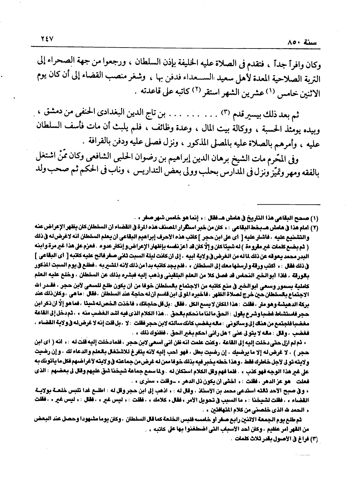 وكان وافراً جداً، فتقدم في الصلاة عليه الخليفة بإذن السلطان، ورجعوا من جهة الصحراء إلى التربة الصلاحية المعدة لأهل سعيد السعداء فدفن بها، وشغر منصب القضاء إلى أن كان يوم الاثنين خامس عشري الشهر، استقر كاتبه على قاعدته، ثم بعد ذلك بيسير قدم.. ابن تاج الدين البغدادي الحنفي من دمشق وبيده يومئذ الحسبة ووكالة بيت المال وعدة وظائف، فلم يلبث أن مات، فأسف السلطان عليه وأمرهم بالصلاة عليه بالمصلى المذكور ونزل فصلى عليه، ودفن بالقرافة.