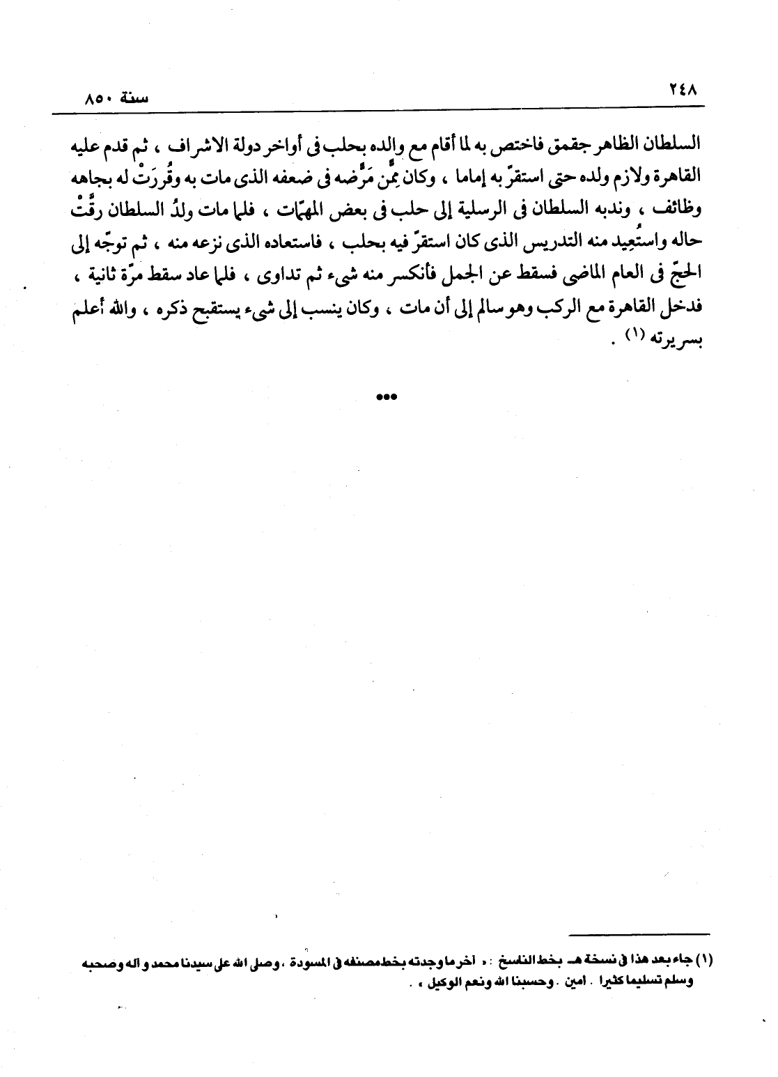 السلطان الظاهر جقمق فاختص به لما أقام مع والده بحلب في أواخر دولة الاشرف، ثم قدم عليه القاهرة فلازم ولده حتى استقر به إماماً، وكان ممن مرضه في ضعفه الذي مات به وقررت له بجاهه وظائف، وندبه السلطان في الرسلية إلى حلب في بعض المهمات فلما مات ولد السلطان رقت حاله واستعيد منه التدريس الذي كان استقر فيه بحلب بجاهه، فاستعاده الذي نزعه منه، ثم توجه إلى الحج في العام الماضي، فسقط عن الجمل فانكسر منه شيء ثم تداوى، فلما رجع سقط مرة أخرى، فدخل القاهرة مع الركب وهو سالم إلى أن مات، وكان ينسب إلى شيء يستقبح ذكره - والله اعلم بسريرته.
